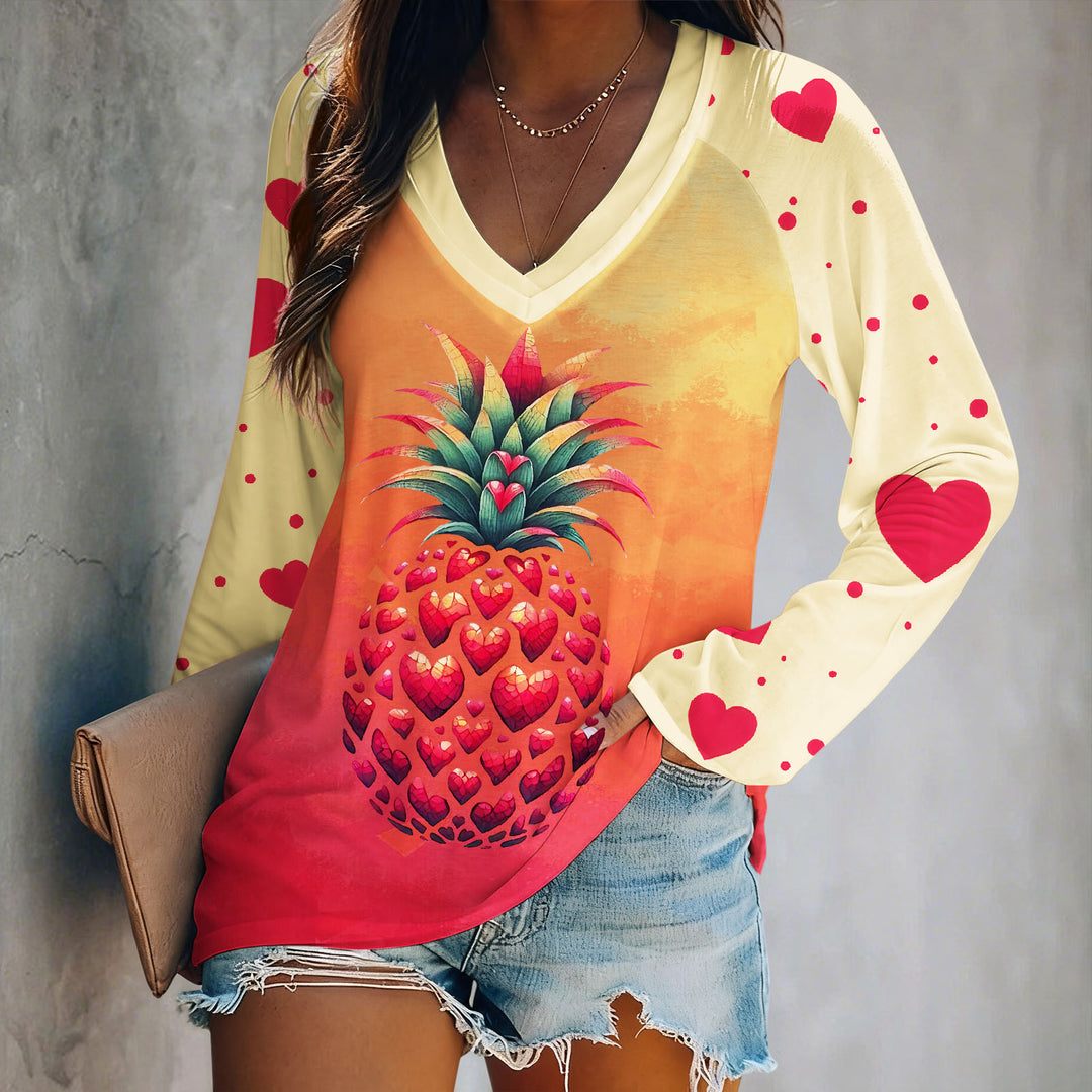 Valentine's Day Pineapple Print V-Neck Long-Sleeved Top