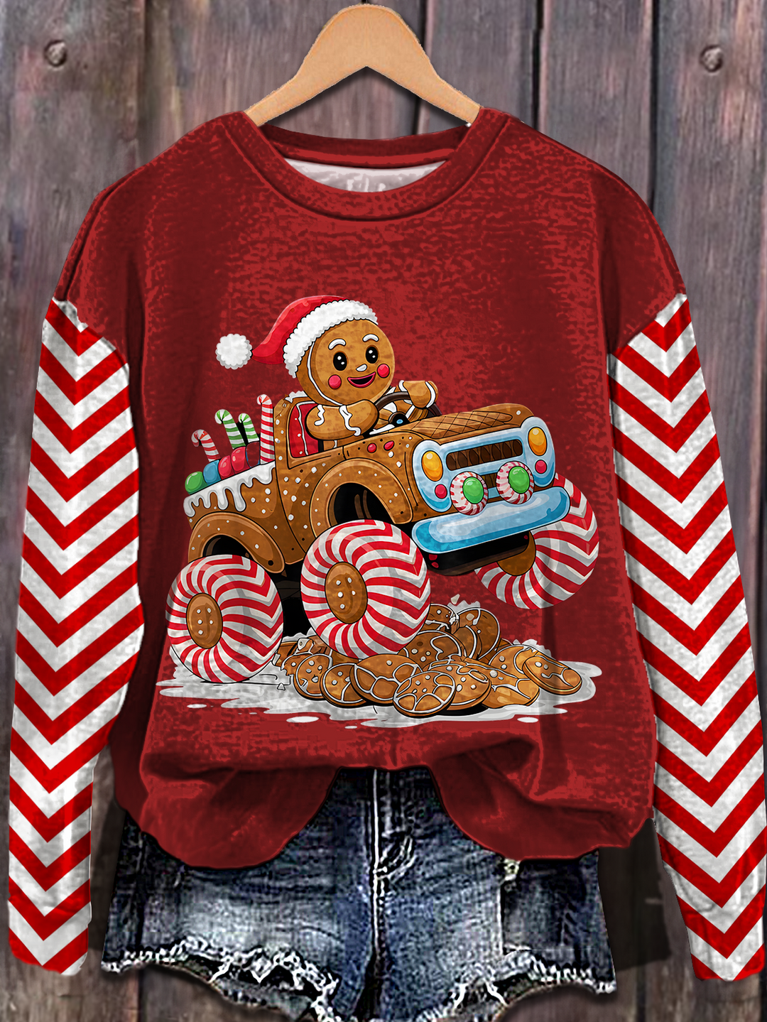 Christmas Gingerbread Man Monster Truck Printed Long Sleeve Casual Top