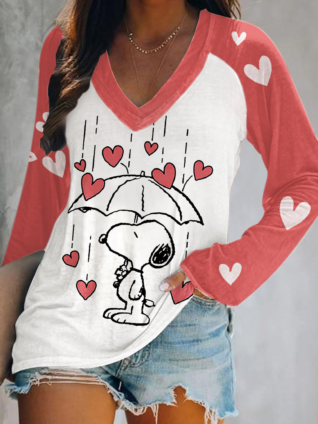 Snoopy Love Rain Print V-Neck Long Sleeve Top