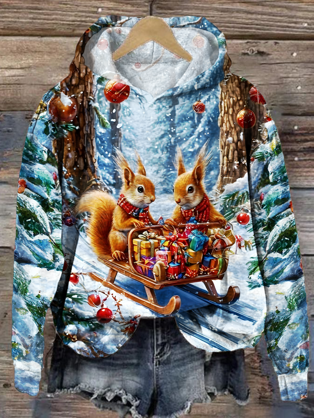 Cute Christmas Squirrels Long Sleeve Printed Hoodie