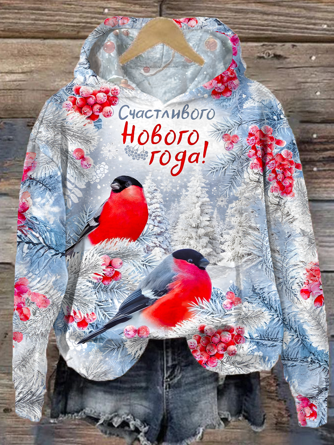 Christmas And New Year Holidays Snow Forest Red Finches Long Sleeve Printed Hoodie