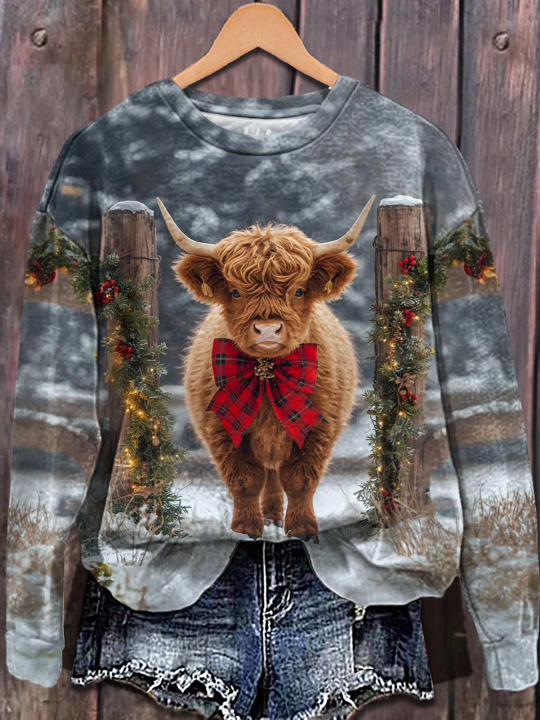 Retro Christmas Highland Cow Printed Long Sleeve Casual Top
