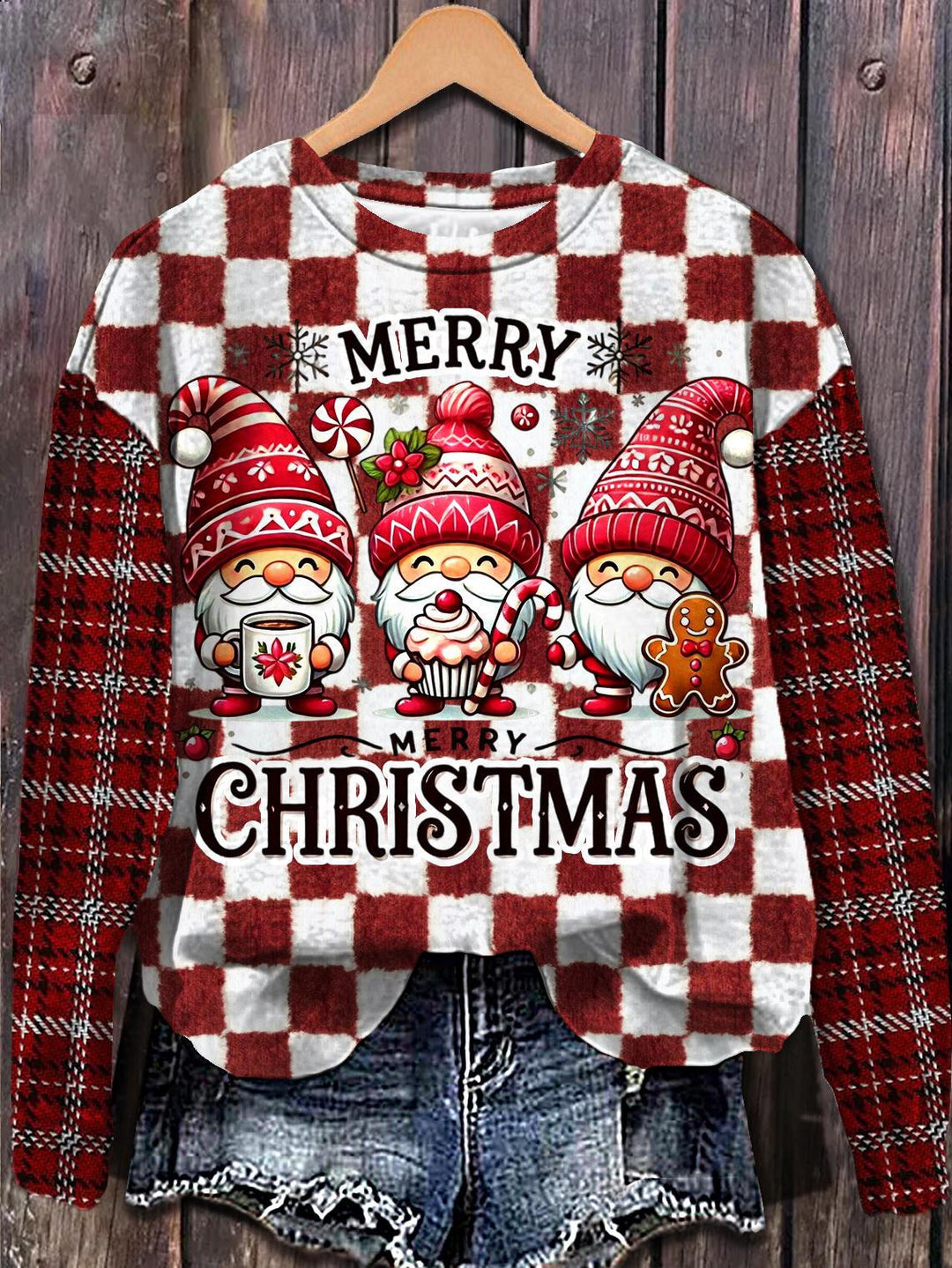 Christmas Plaid Dwarf Print Long Sleeve Casual Top