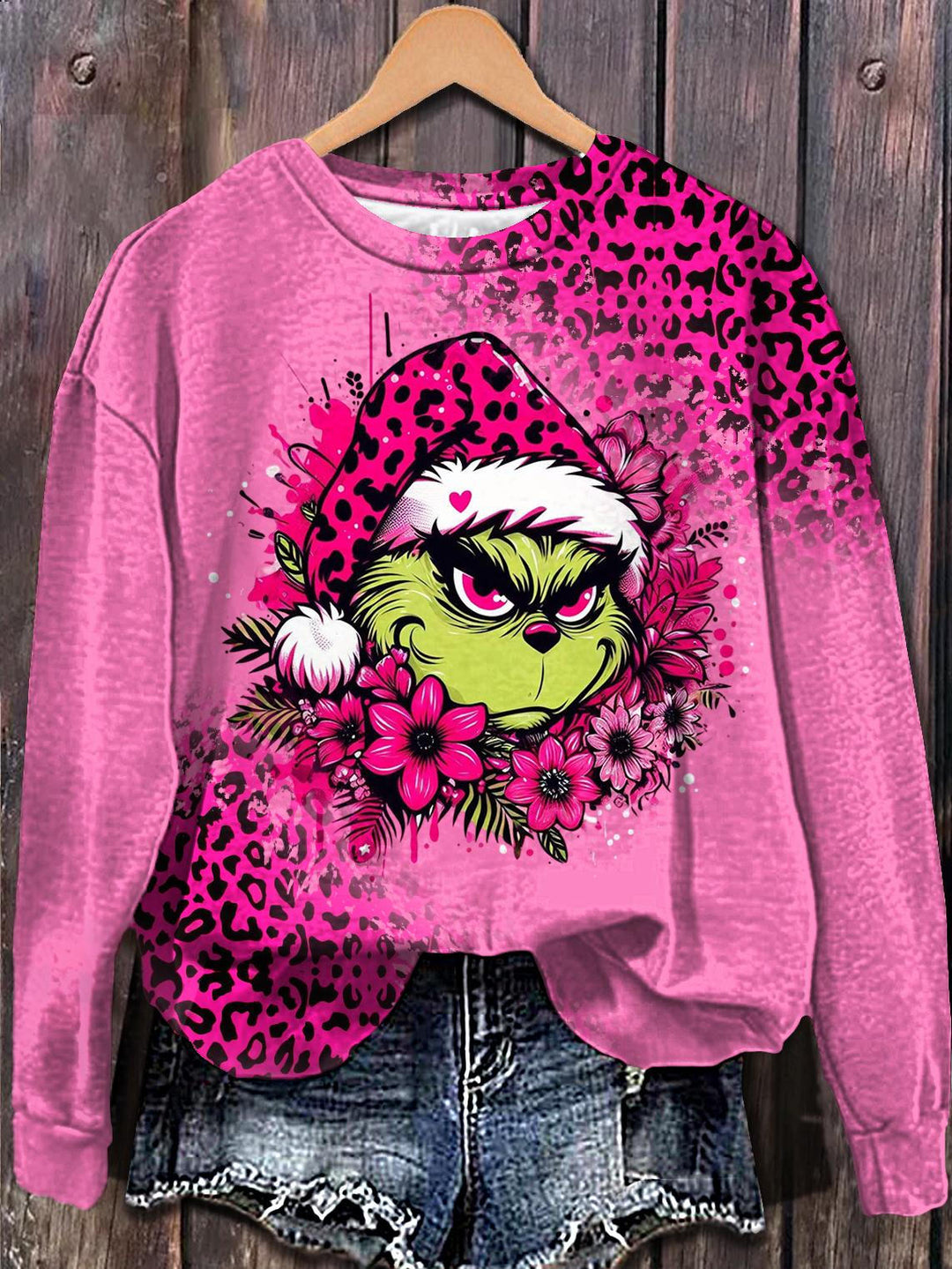Valentine's Day Leopard Print Grinch Long Sleeve Casual Top