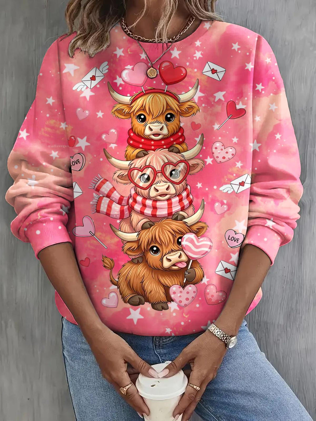 Valentine's Day Highland Cow Print Long Sleeve Casual Top