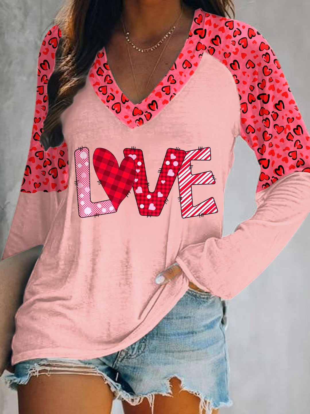 Valentine's Day Heart Print V-Neck Long Sleeve Top