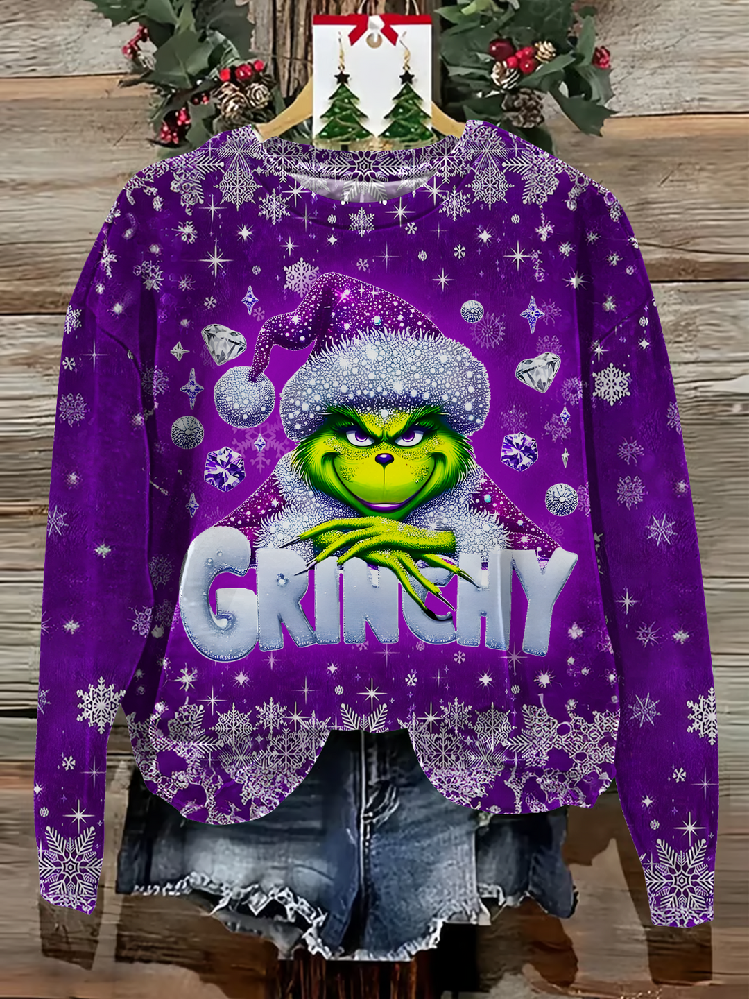 Purple Diamond Christmas Grinch Printed Long Sleeve Casual Top