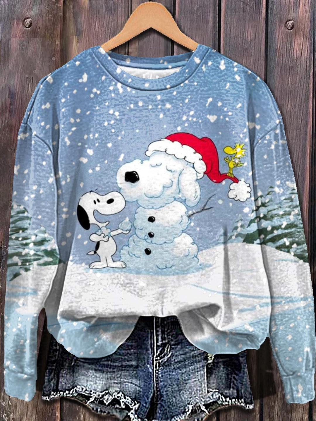 Women's Cute Snowman And Cat Christmas Printed Long Sleeve Casual Top