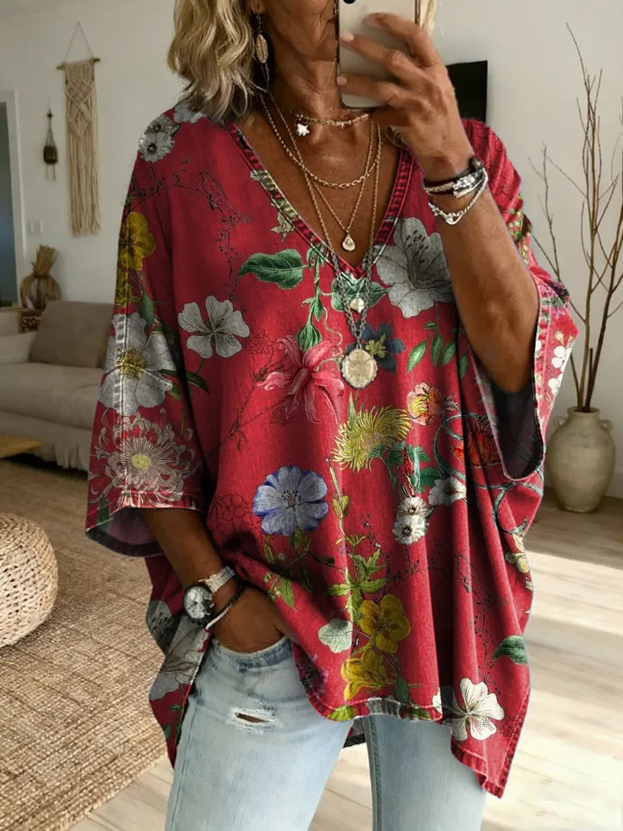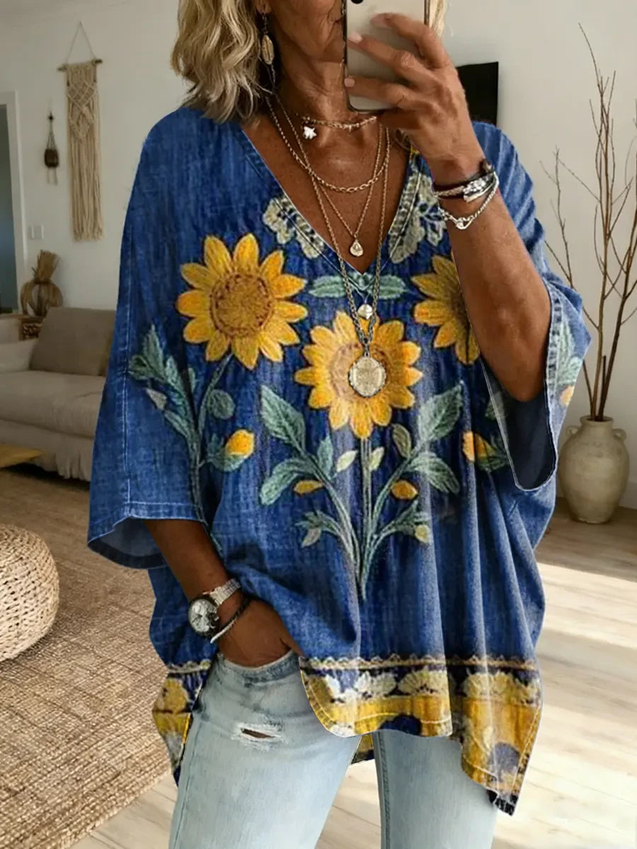 Women's Bohemian Retro Sunflower Art Print V-Neck Loose-Fit Denim Top