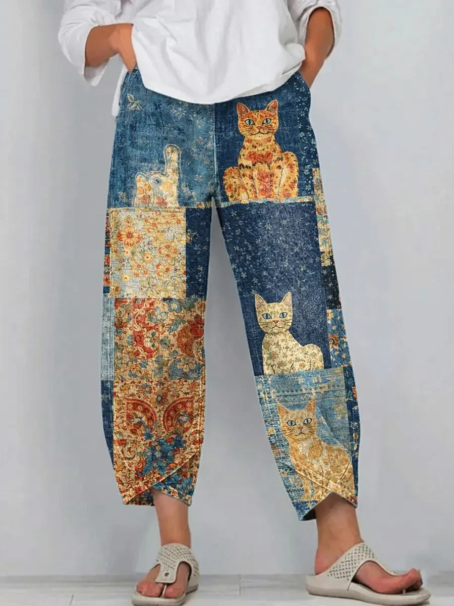 Ethnicity Patchwork Cat Women's Art Pattern Print Casual Denim Cotton Pants