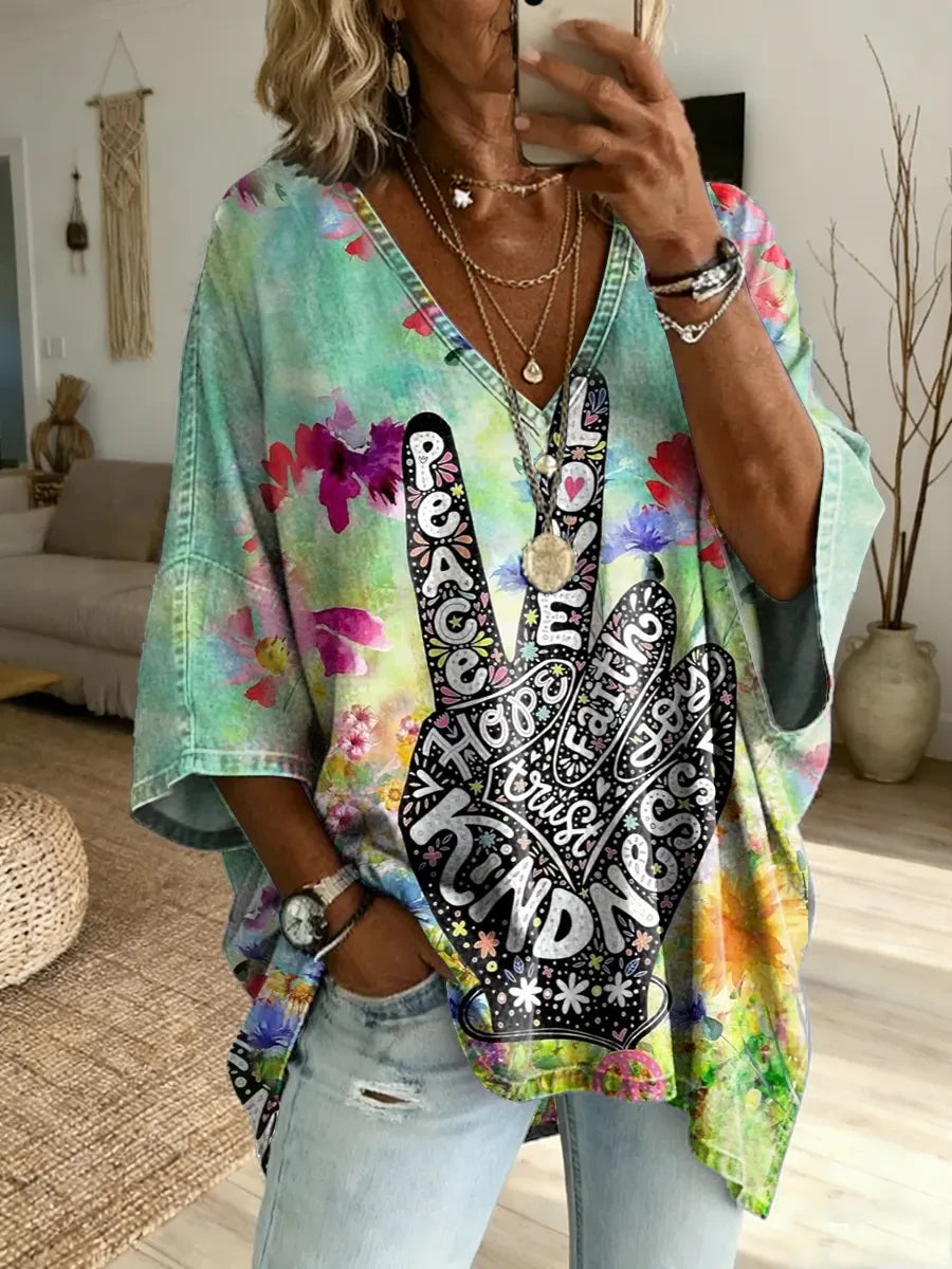 Women's Hippie Peace Love Art Print V-Neck Loose-Fit Denim Top