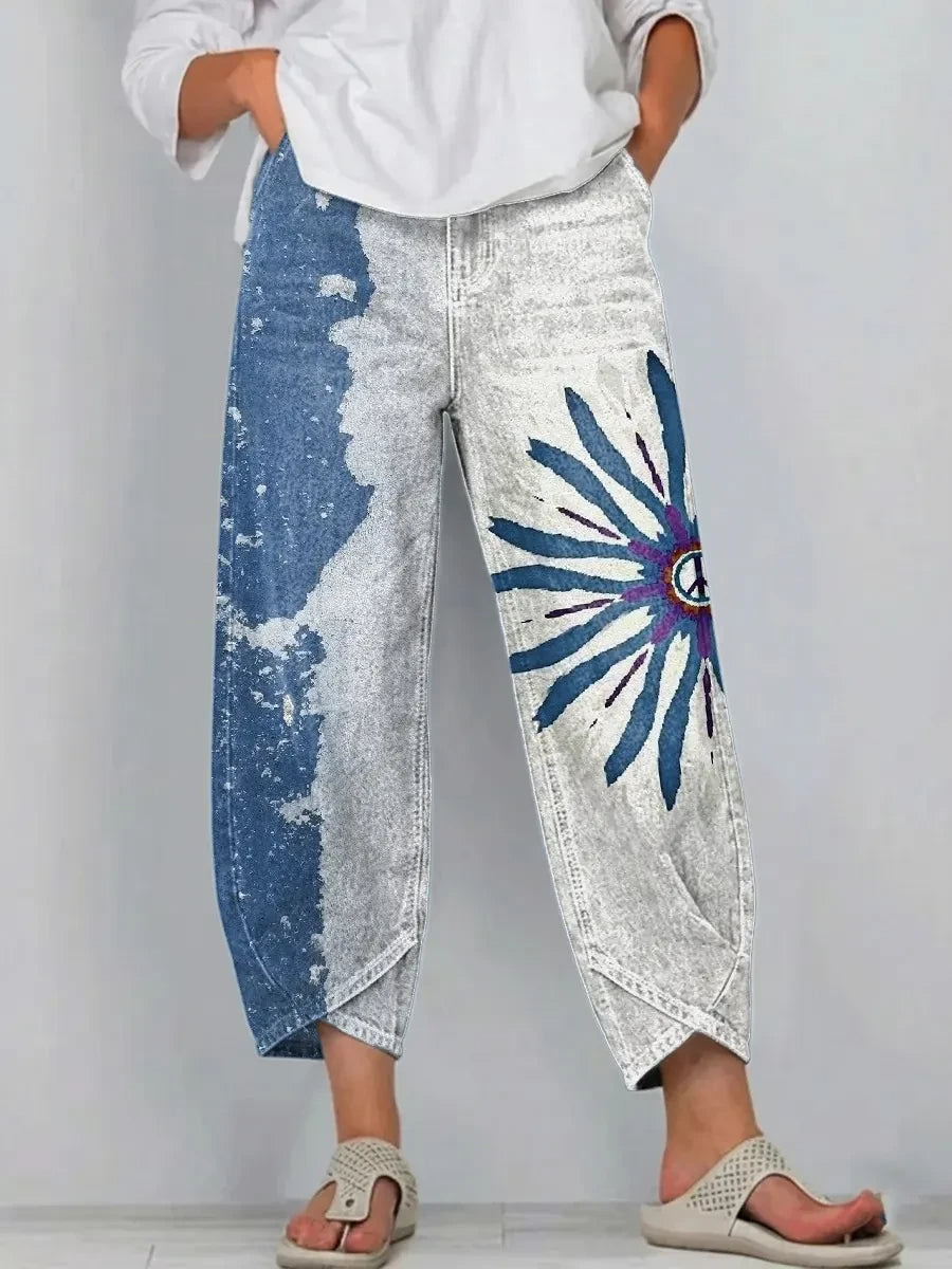 Hippie Flowers Geometry Women's Art Pattern Print Casual Denim Cotton Pants