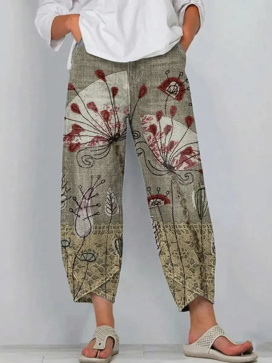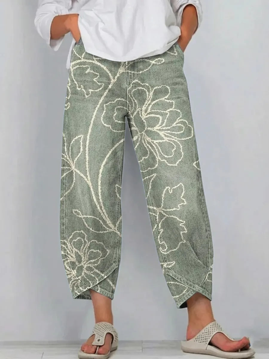 Ethnicity Flowers Lines Women's Art Pattern Print Casual Denim Cotton Pants