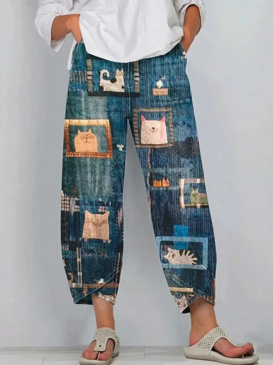 Ethnicity Patchwork Cat Geometry Women's Art Pattern Print Casual Denim Cotton Pants