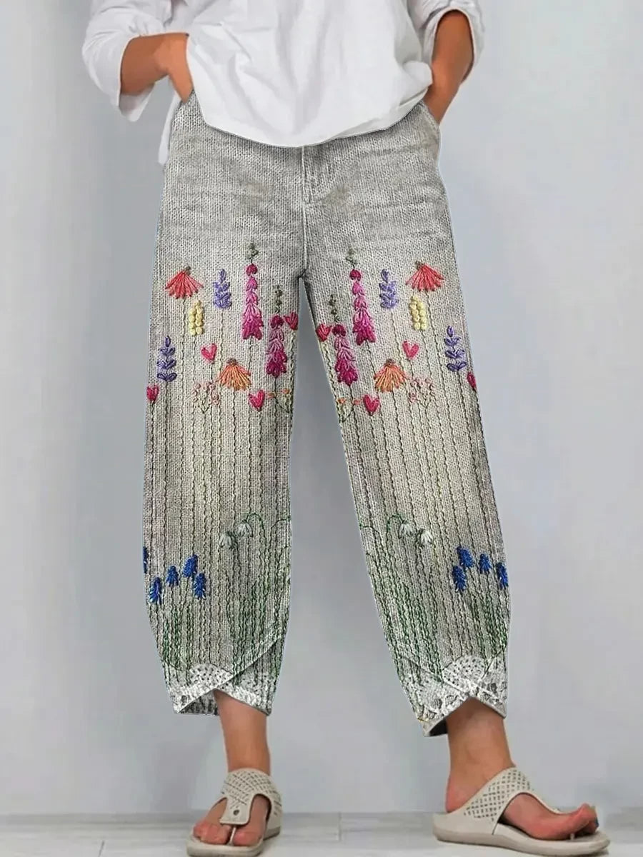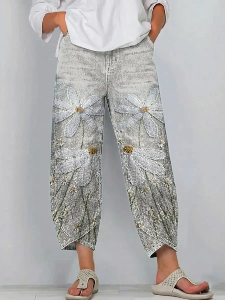 Ethnicity Flowers Women's Art Pattern Print Casual Denim Cotton Pants