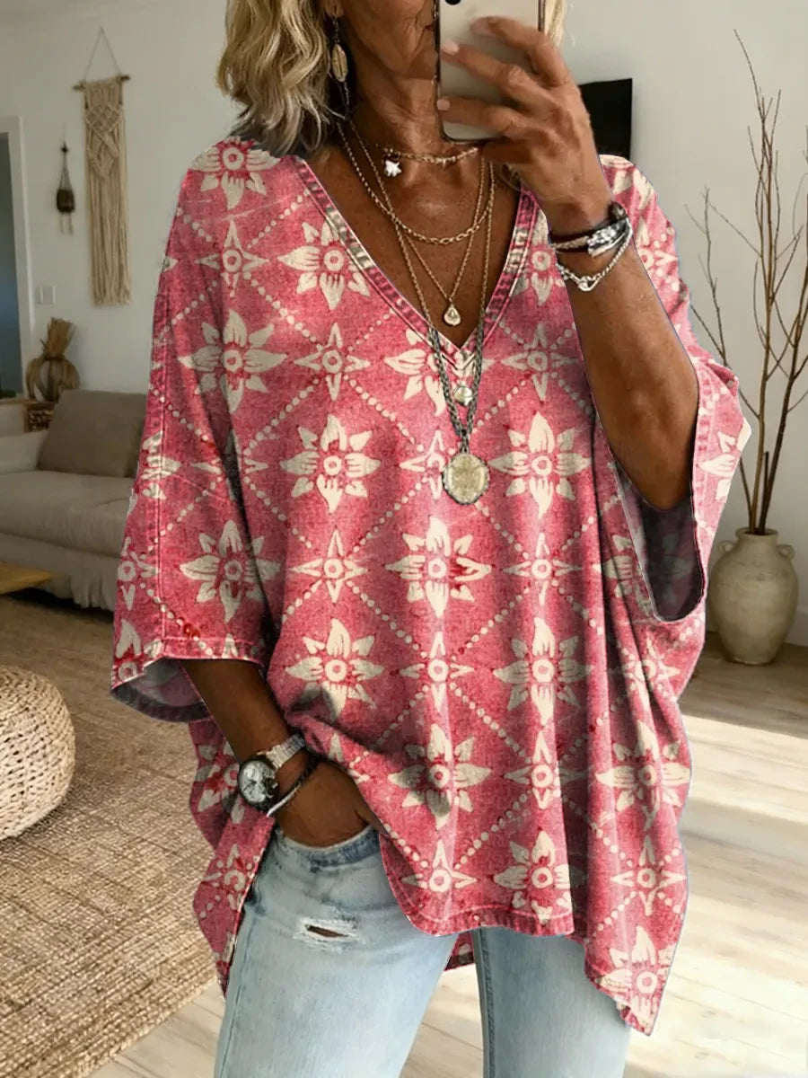 Women's Vintage Pink Argyle Floral Art Print V-Neck Loose-Fit Denim Top