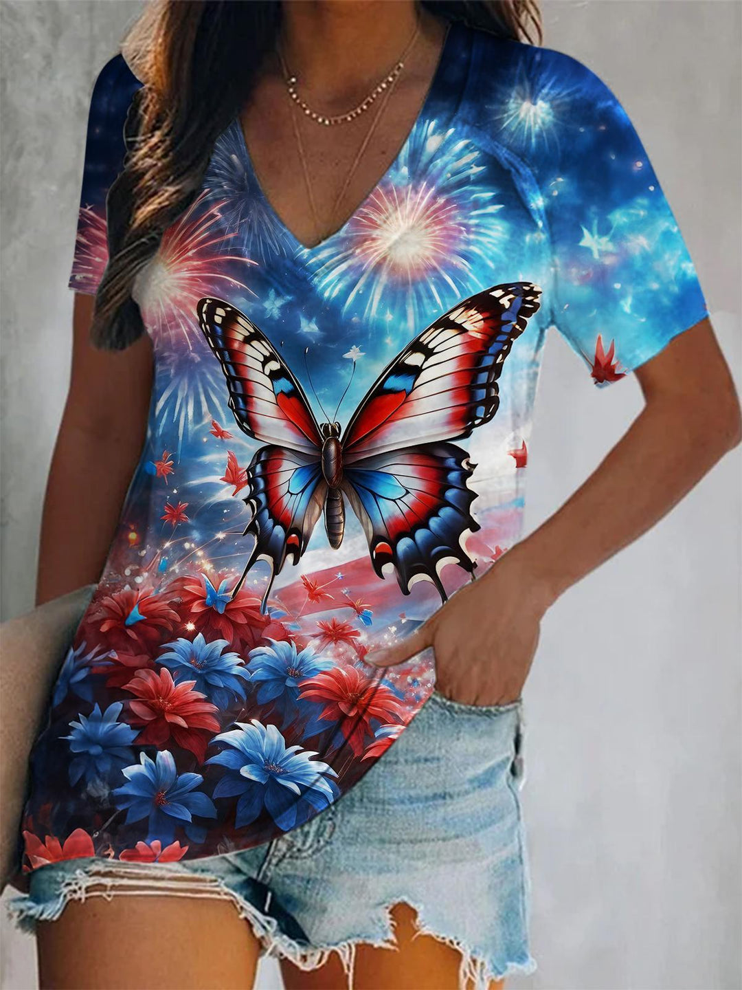 Women's Butterfly Independence Day Short-sleeved V-neck T-shirt
