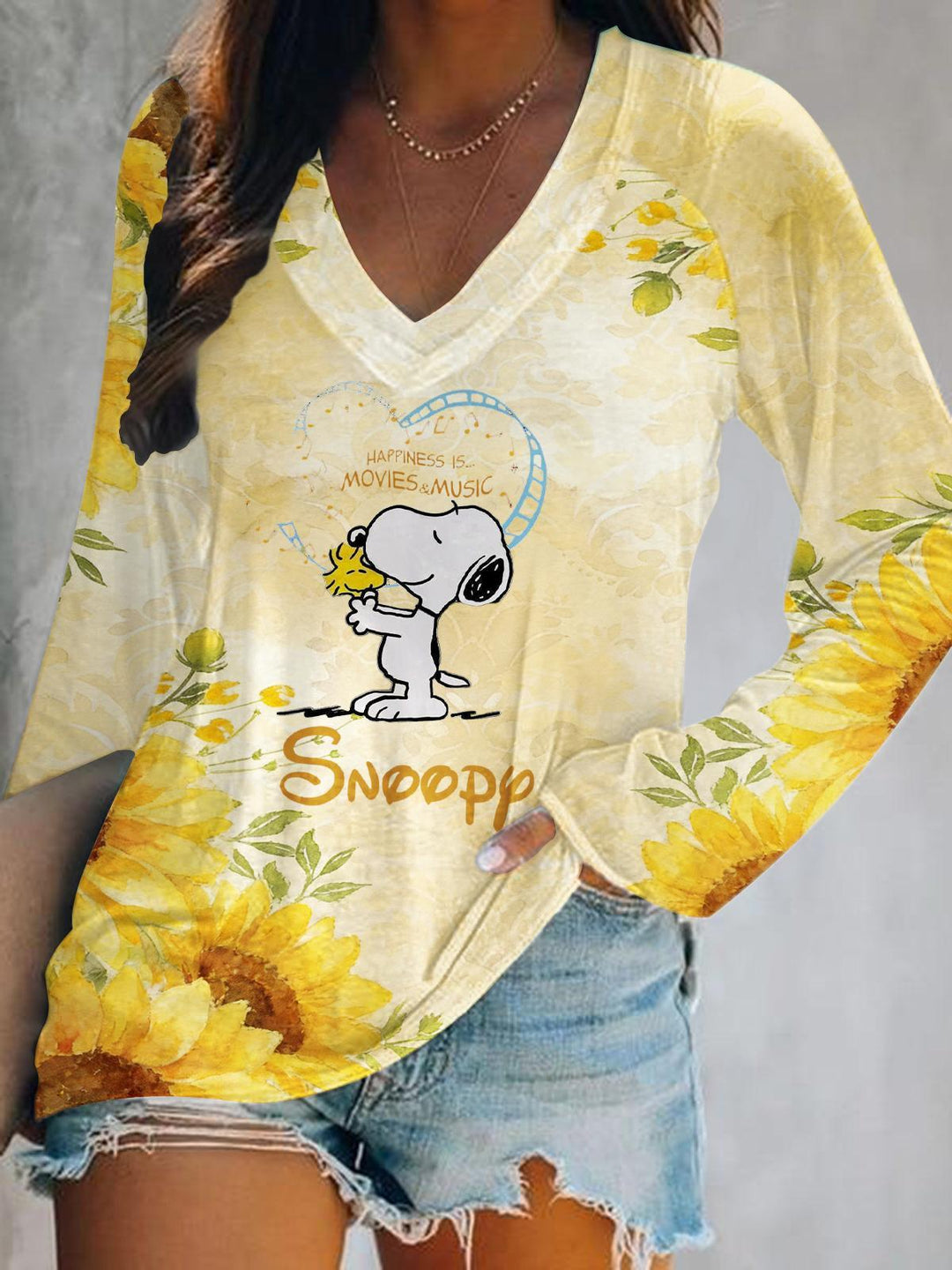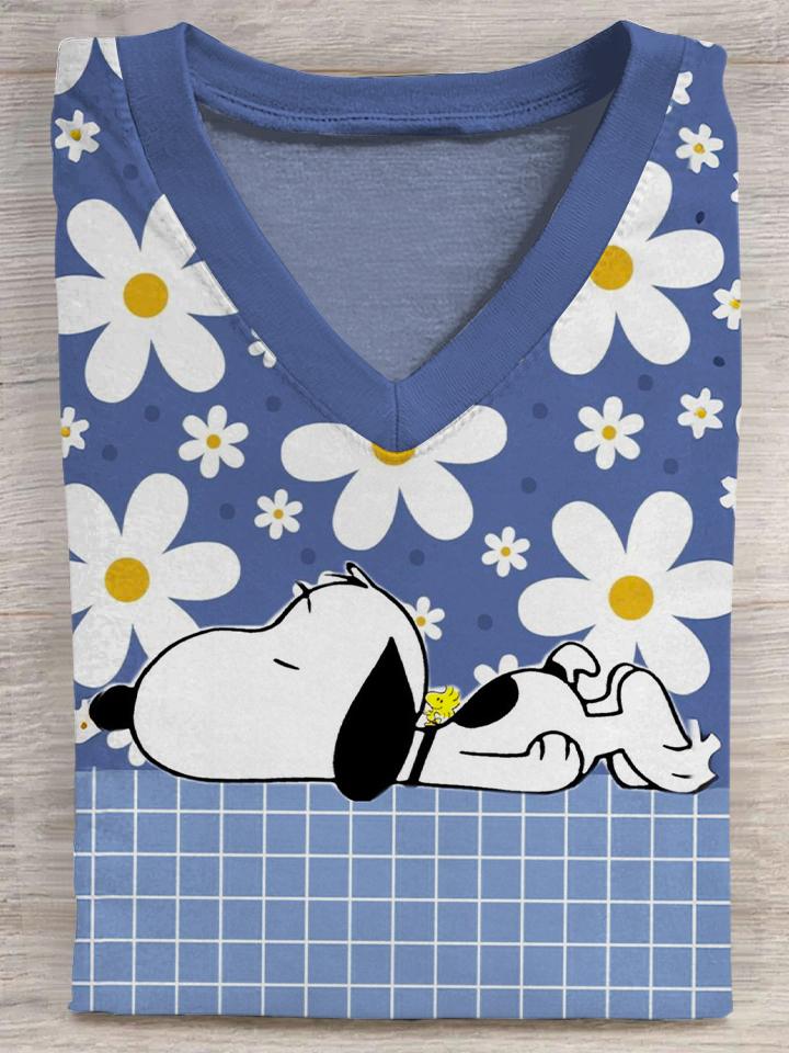 Women's Sunflower Snoopy V-neck Long Sleeve T-shirt