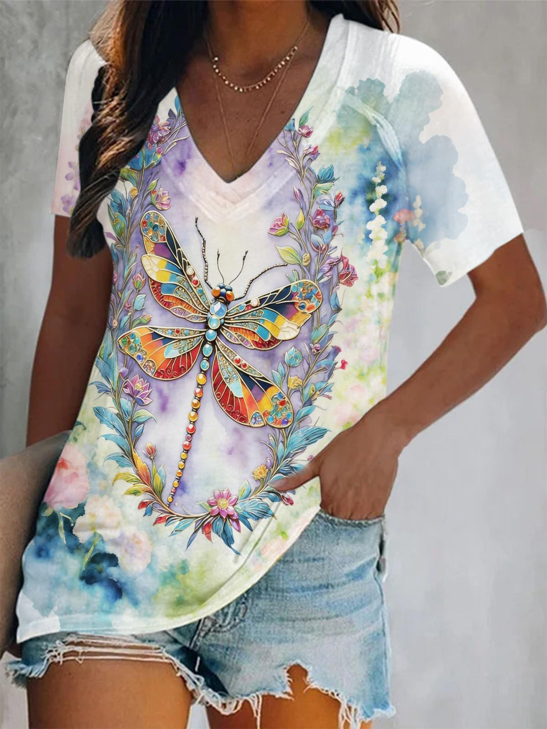 Spring Spotted Dragonfly Short-sleeved V-neck T-shirt