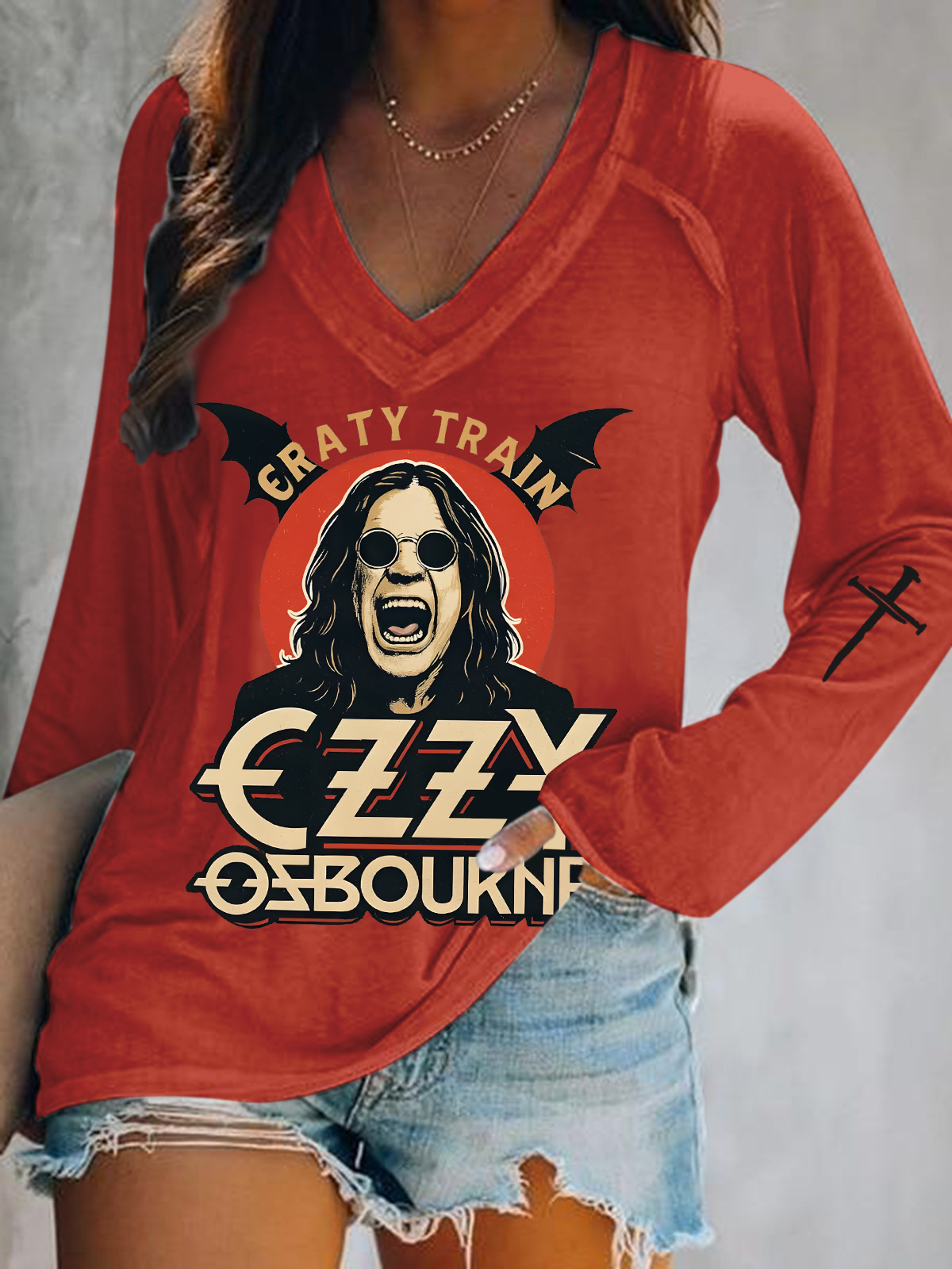 Trendy Ozzy Osbourne Mama I'm Coming Home Print V-Neck Long Sleeve Top