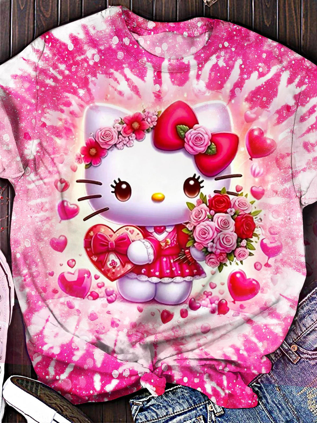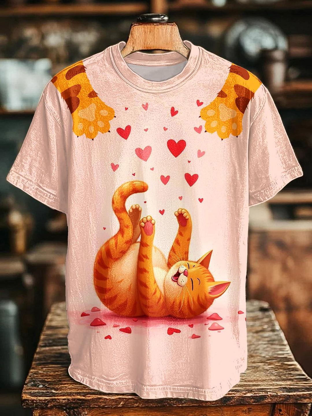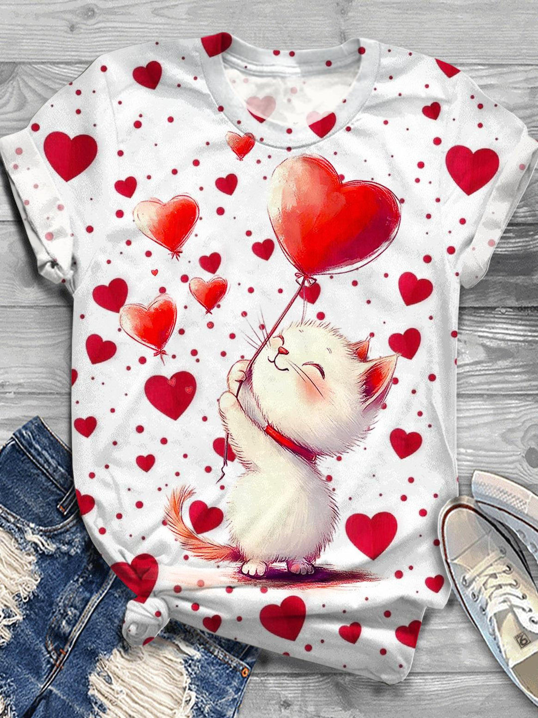 Valentine's Day Heart Cat Print Crew Neck T-shirt