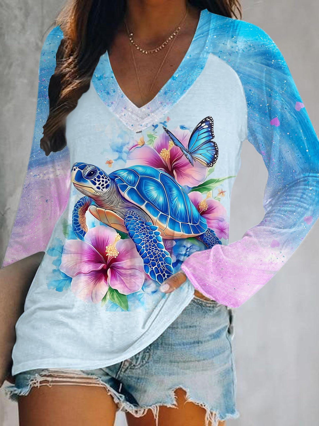 Traveling Turtle Print V-Neck Long Sleeve Top
