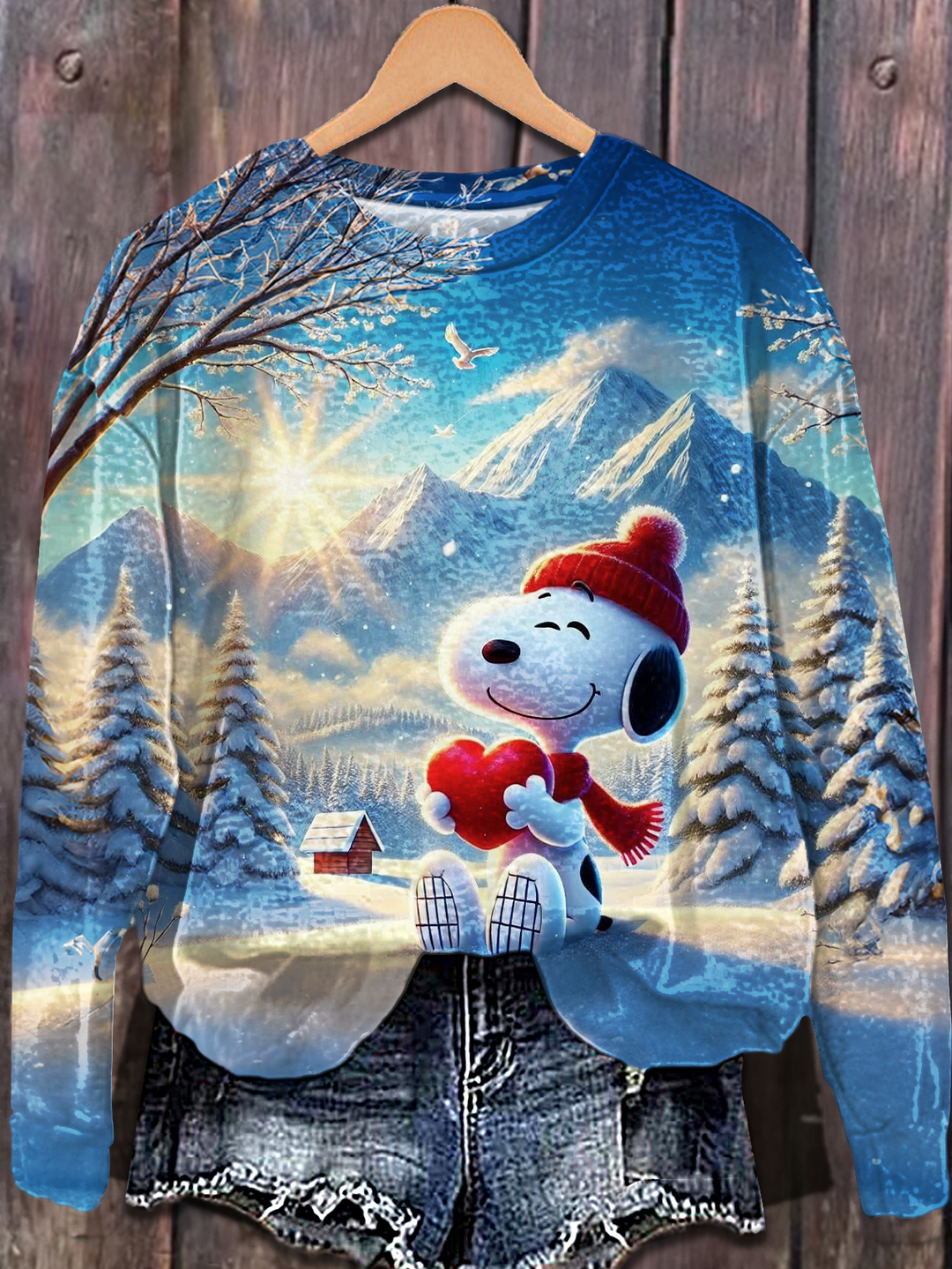 Fun Winter Snoopy With Heart Printed Long Sleeve Casual Top