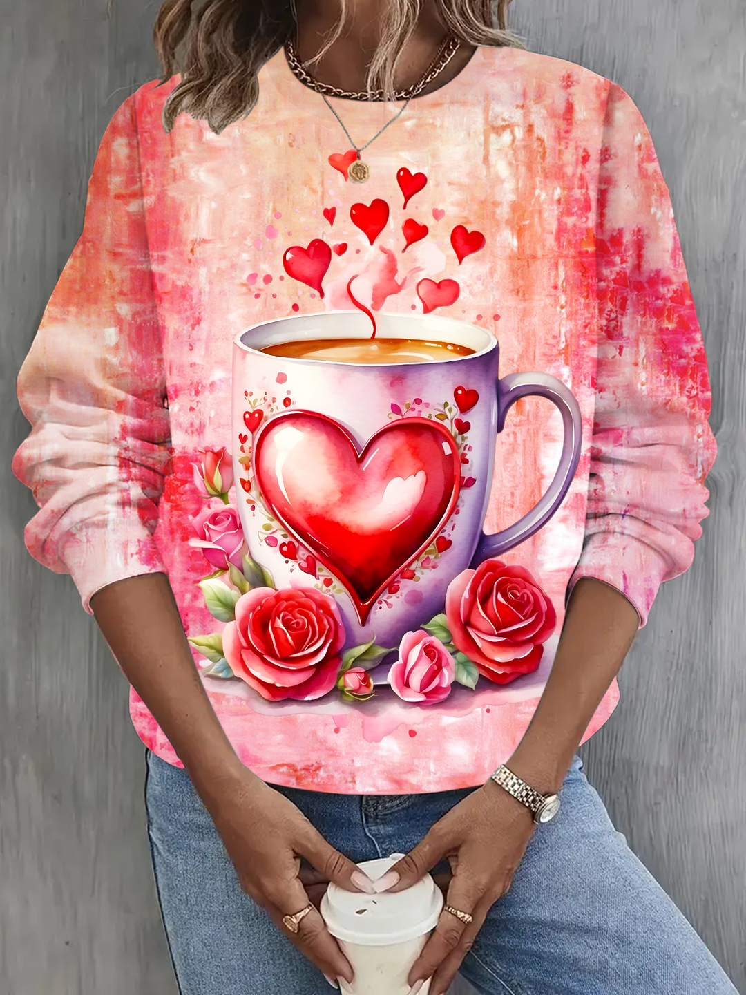 Red Rose Valentine Coffee Long Sleeve Casual Top