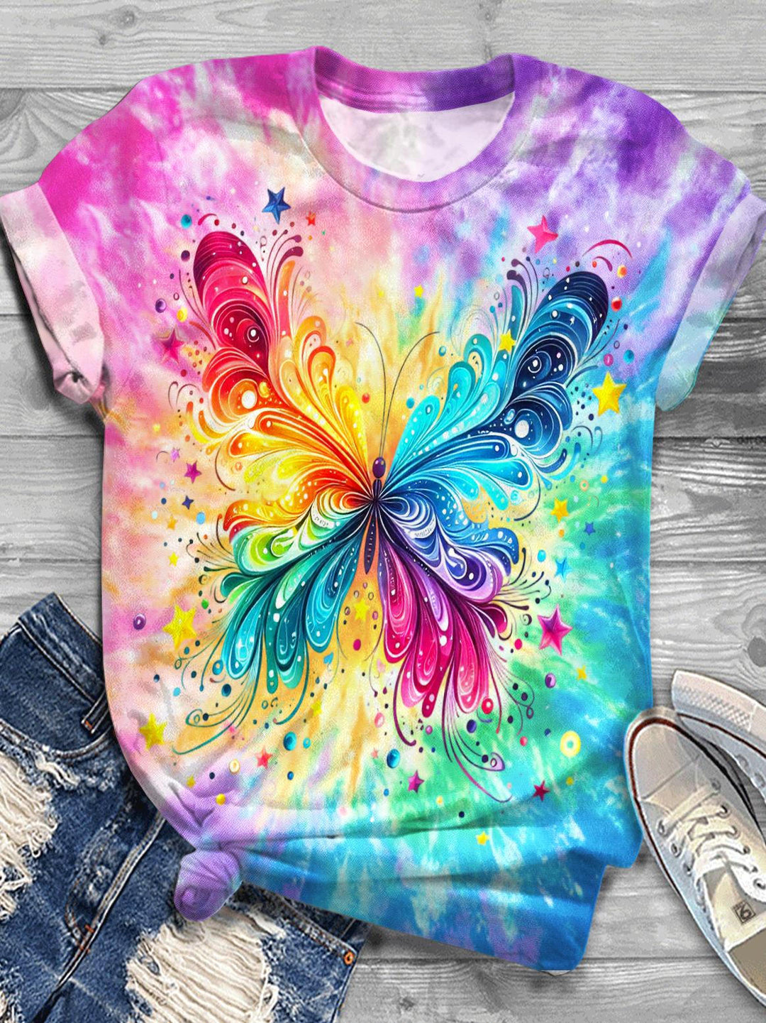 Butterfly Holiday Tie-Dye Print Crew Neck T-shirt
