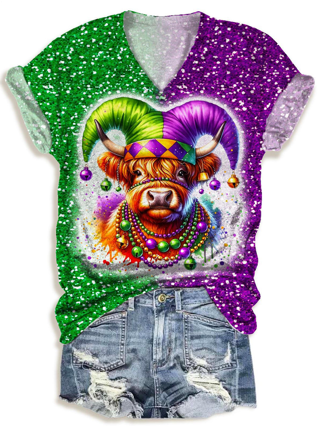 Mardi Gras Highland Cow Print V-neck T-Shirt