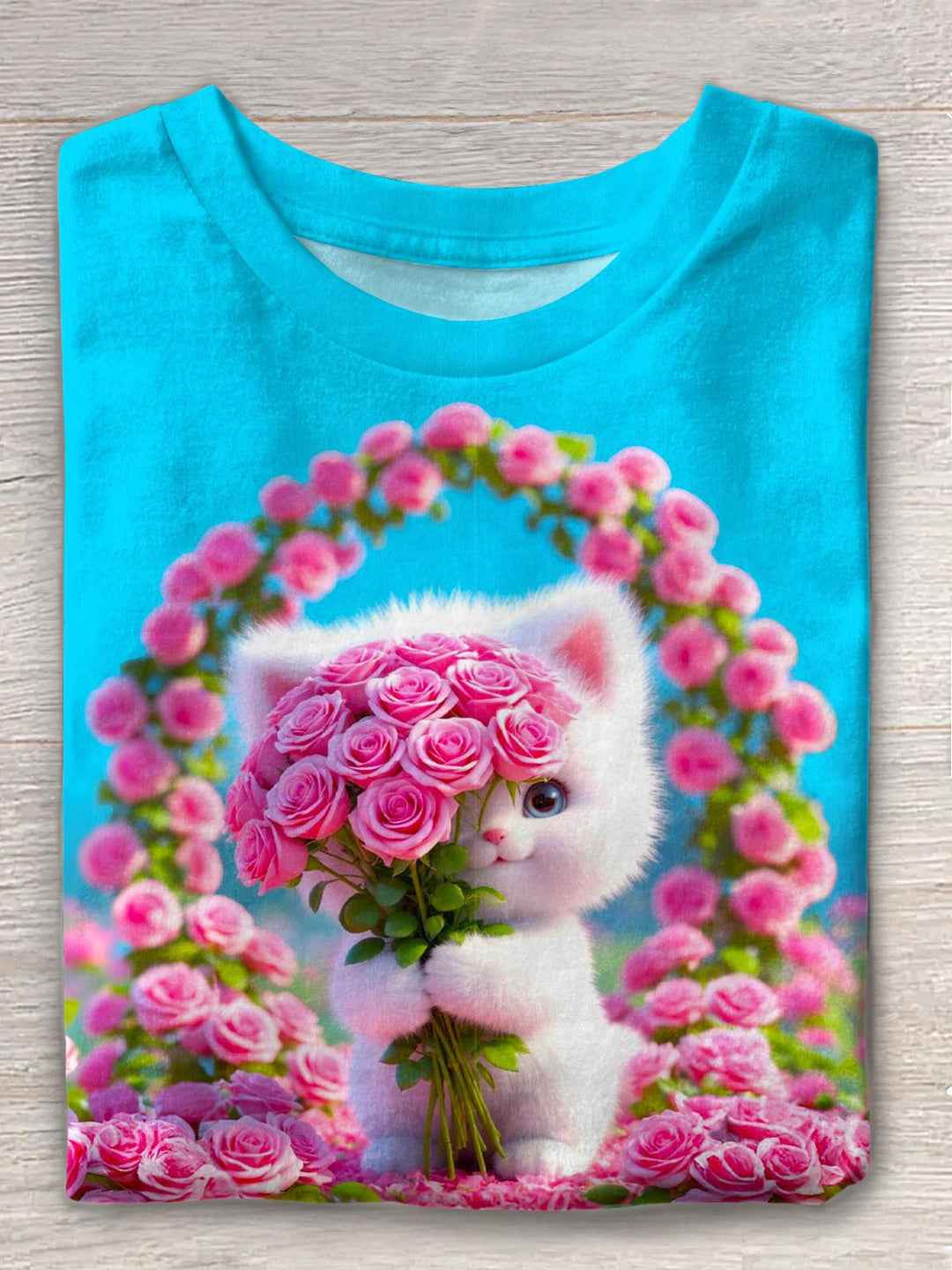 Valentine's Day Cat And Flower Crew Neck T-shirt