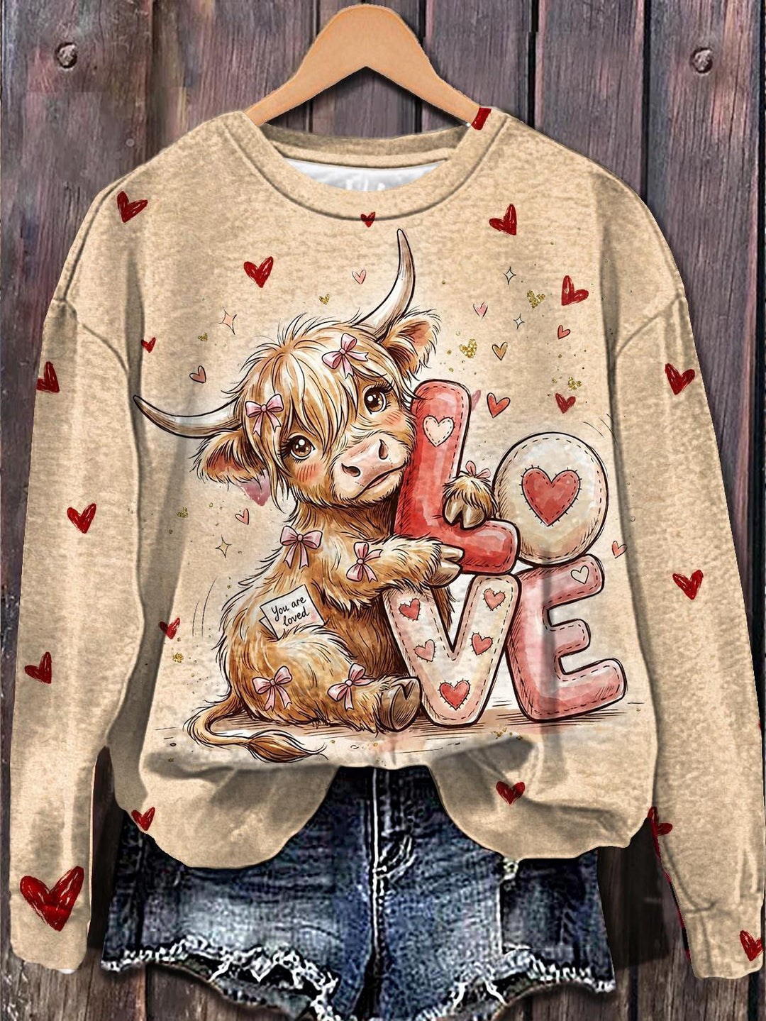 Valentine's Day Cute Highland Cattle Printed Long Sleeve Casual Top