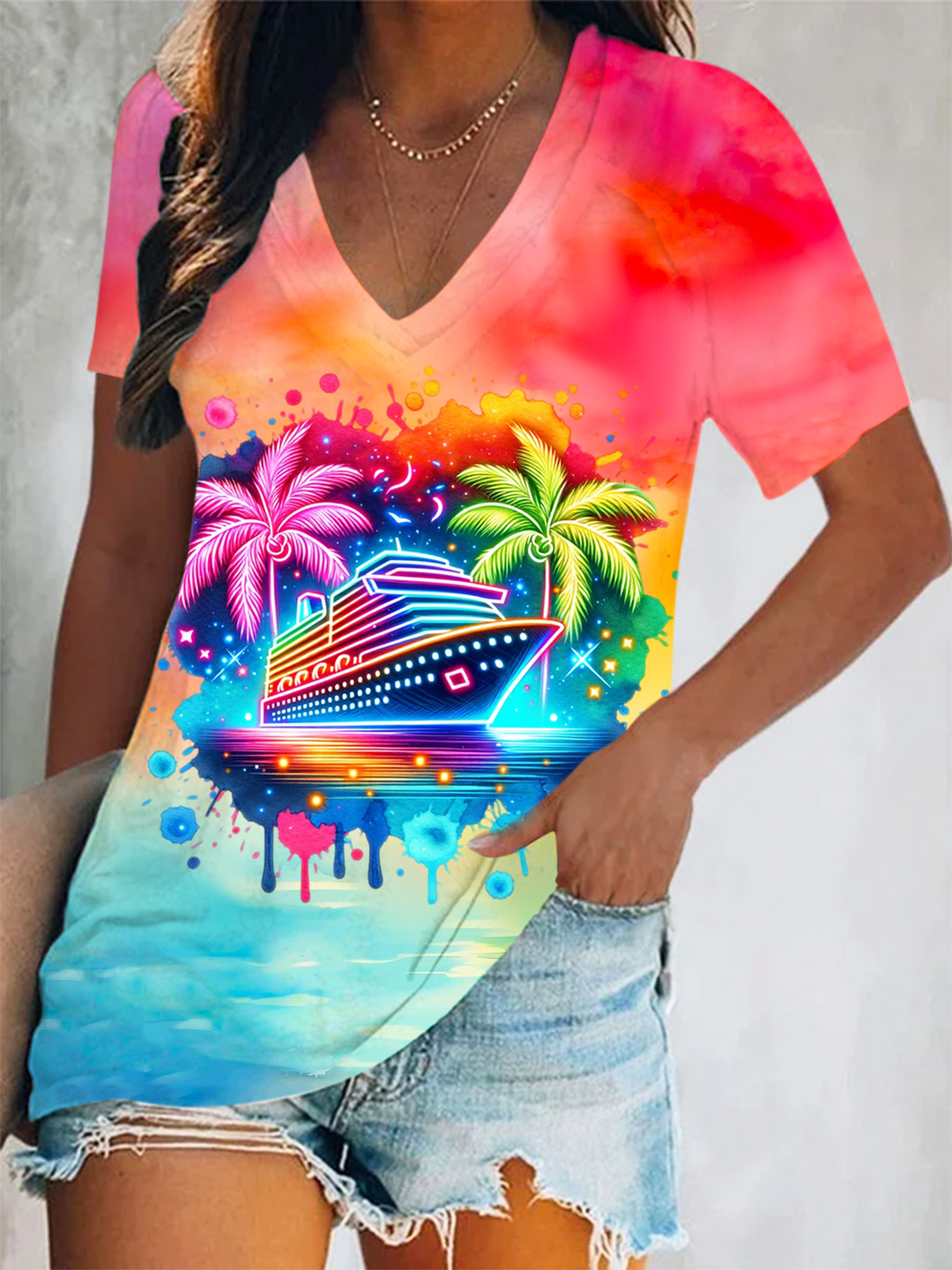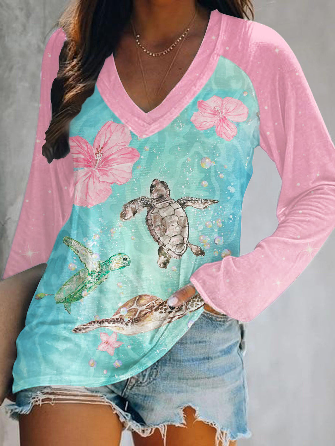 Vacation Turtle Art Print V-Neck Long Sleeve Top