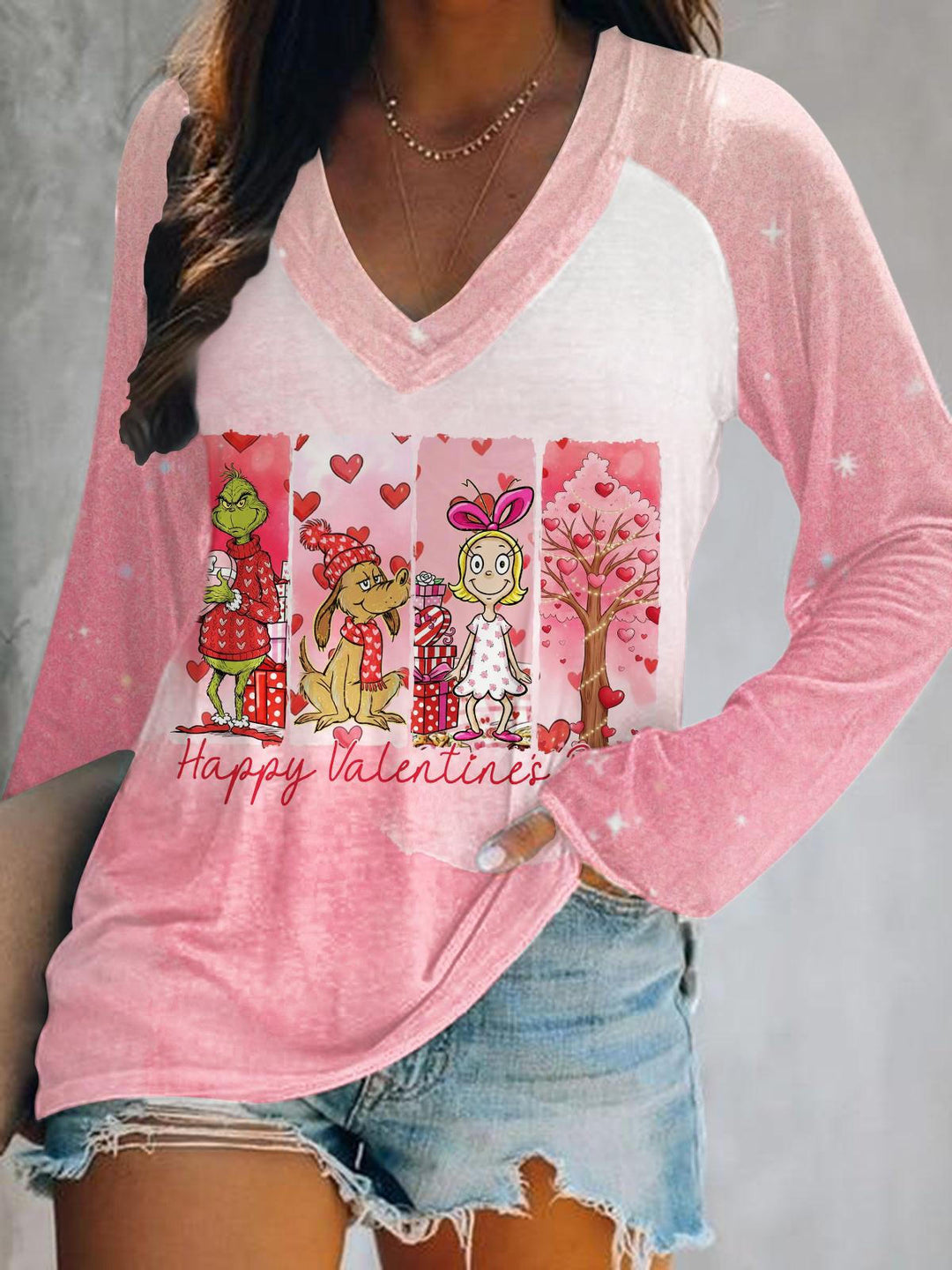 Valentine's Day Grinch Print V-Neck Long Sleeve Top