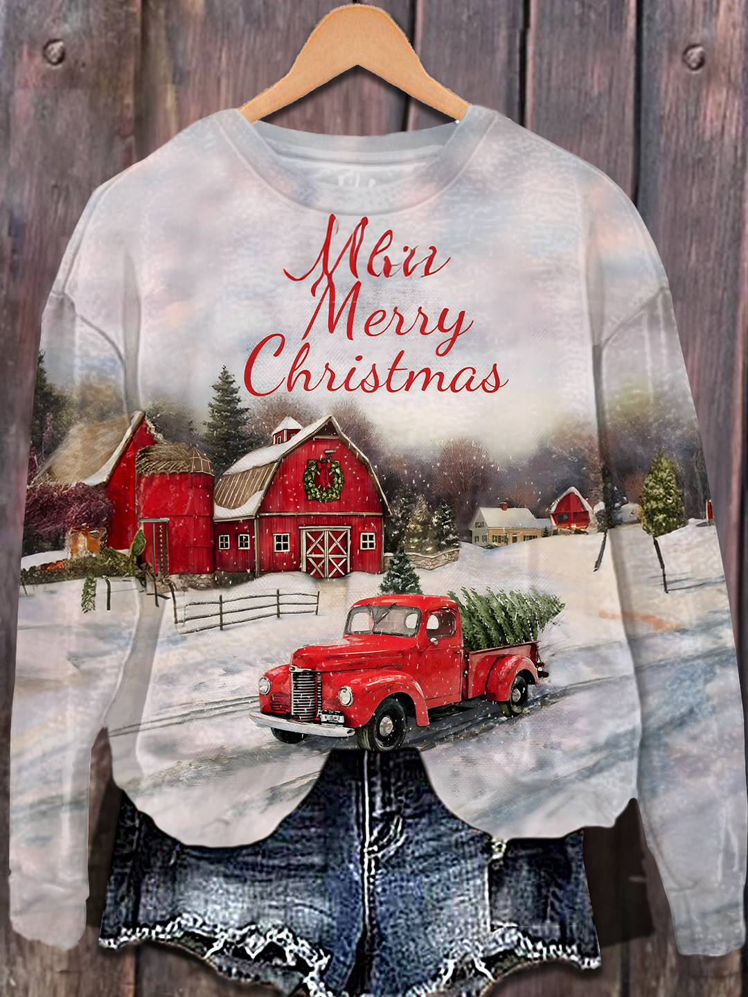 Rustic Merry Christmas Red TruckPrinted Long Sleeve Casual Top