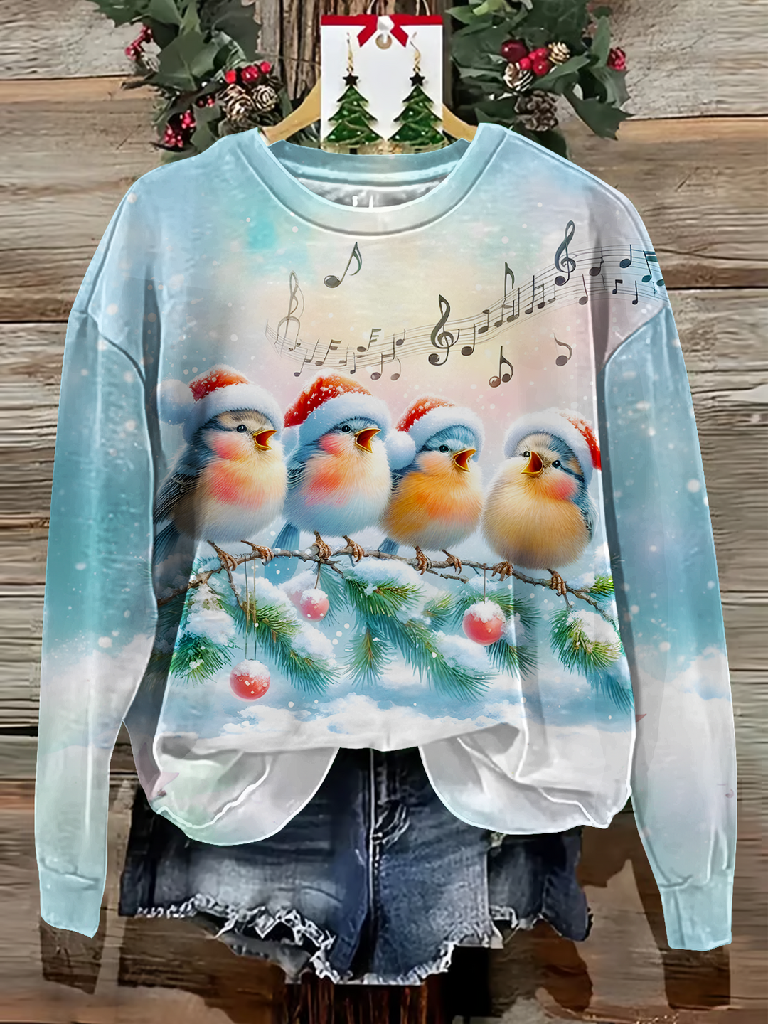 Christmas Bird in The Snow Printed Long Sleeve Casual Top