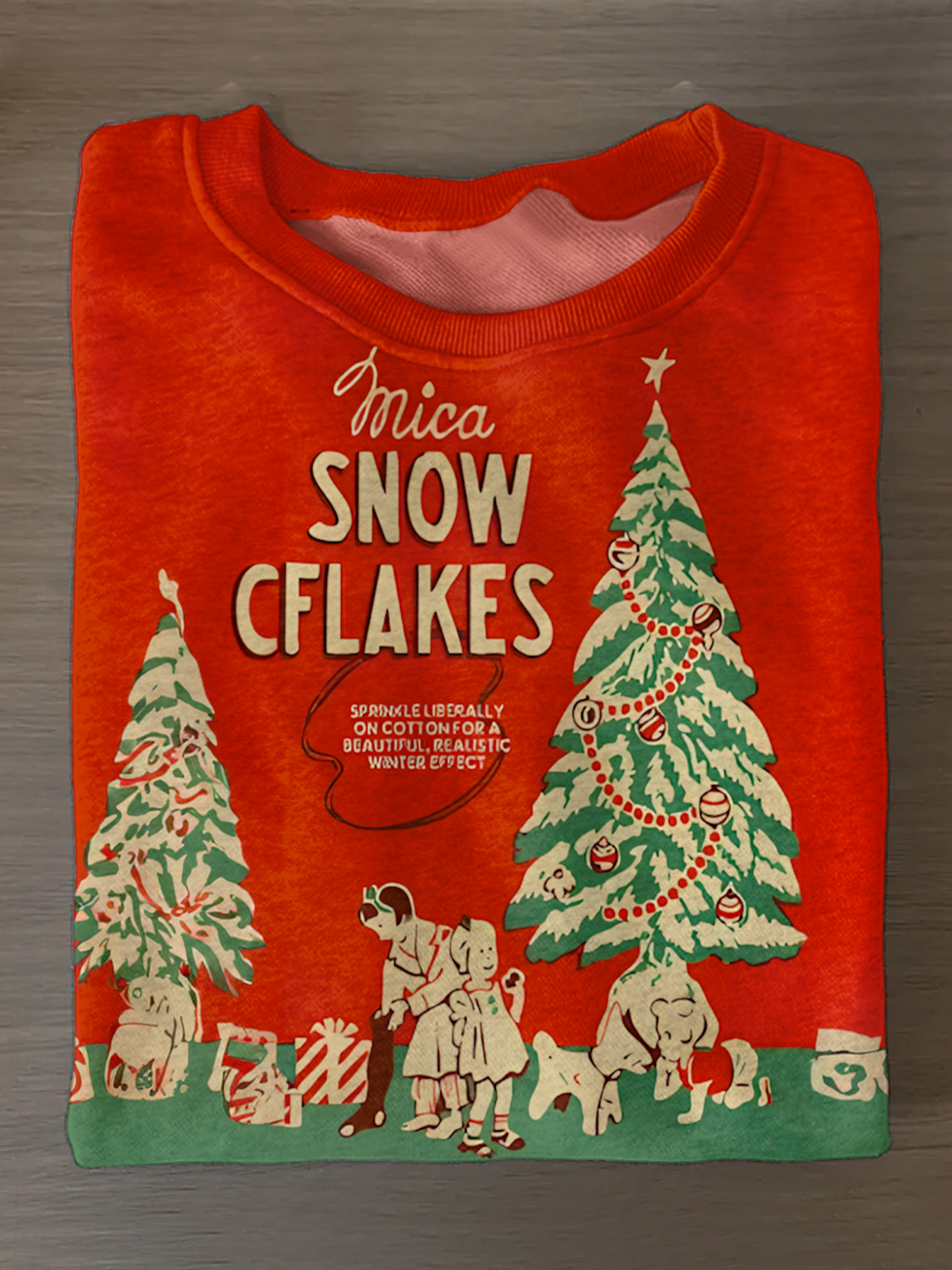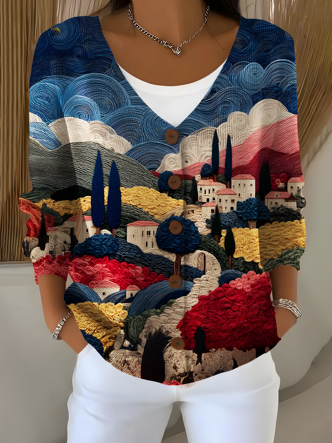 Retro Christmas Art Printed Long Sleeve Casual Top