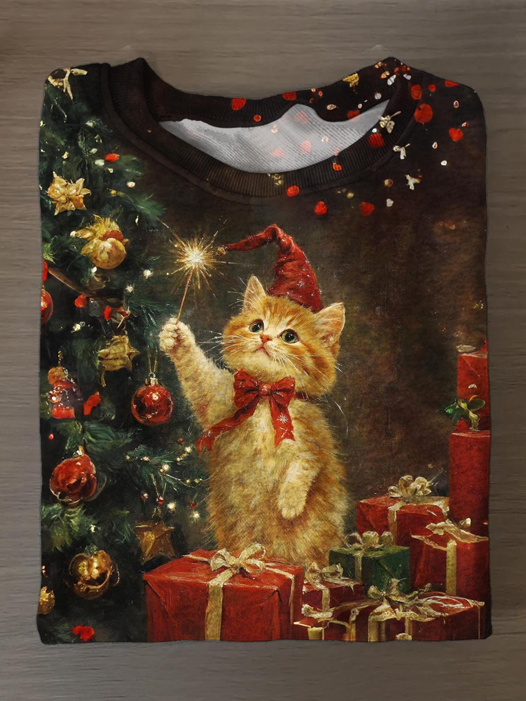 Retro Christmas Cute Kitten Printed Long Sleeve Casual Top