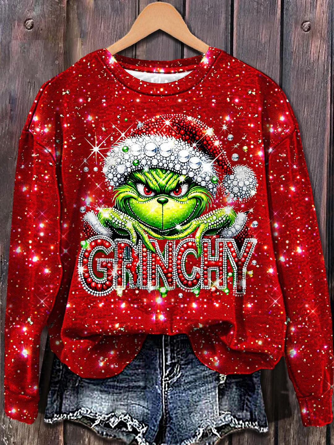 Christmas Sequined Grinch Print Long Sleeve Casual Top