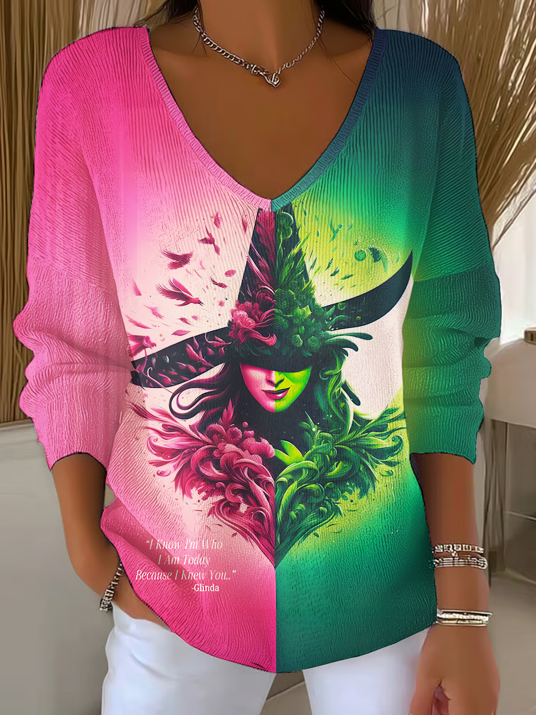 Witch Pink And Green V Neck Pullover Sweater