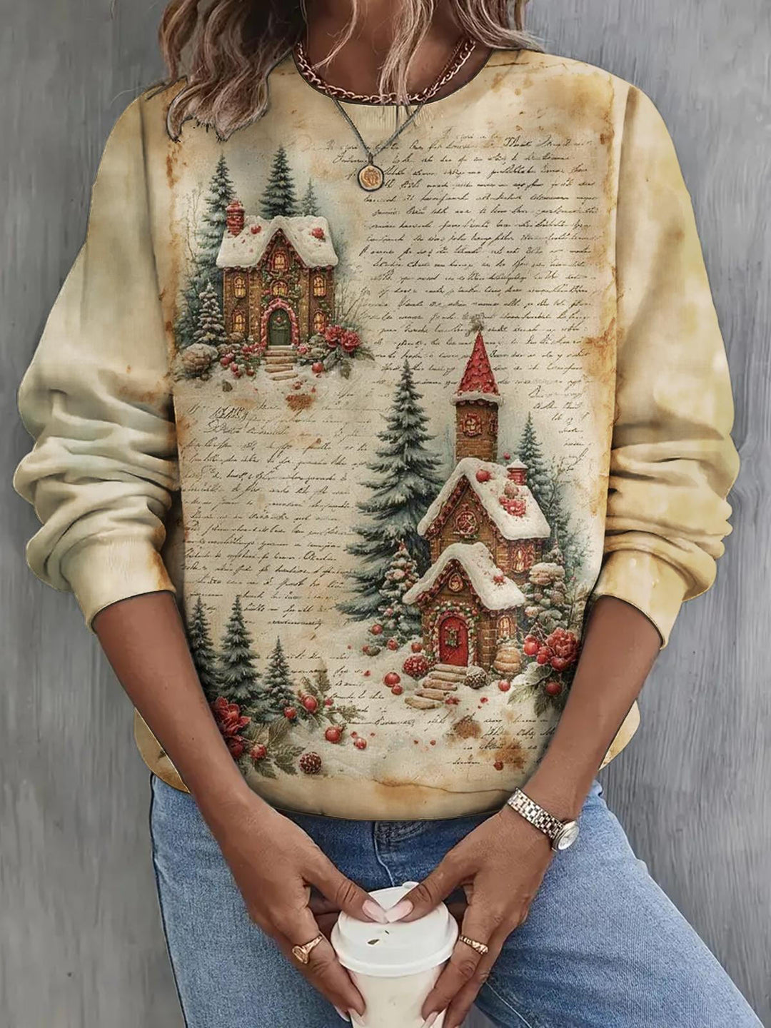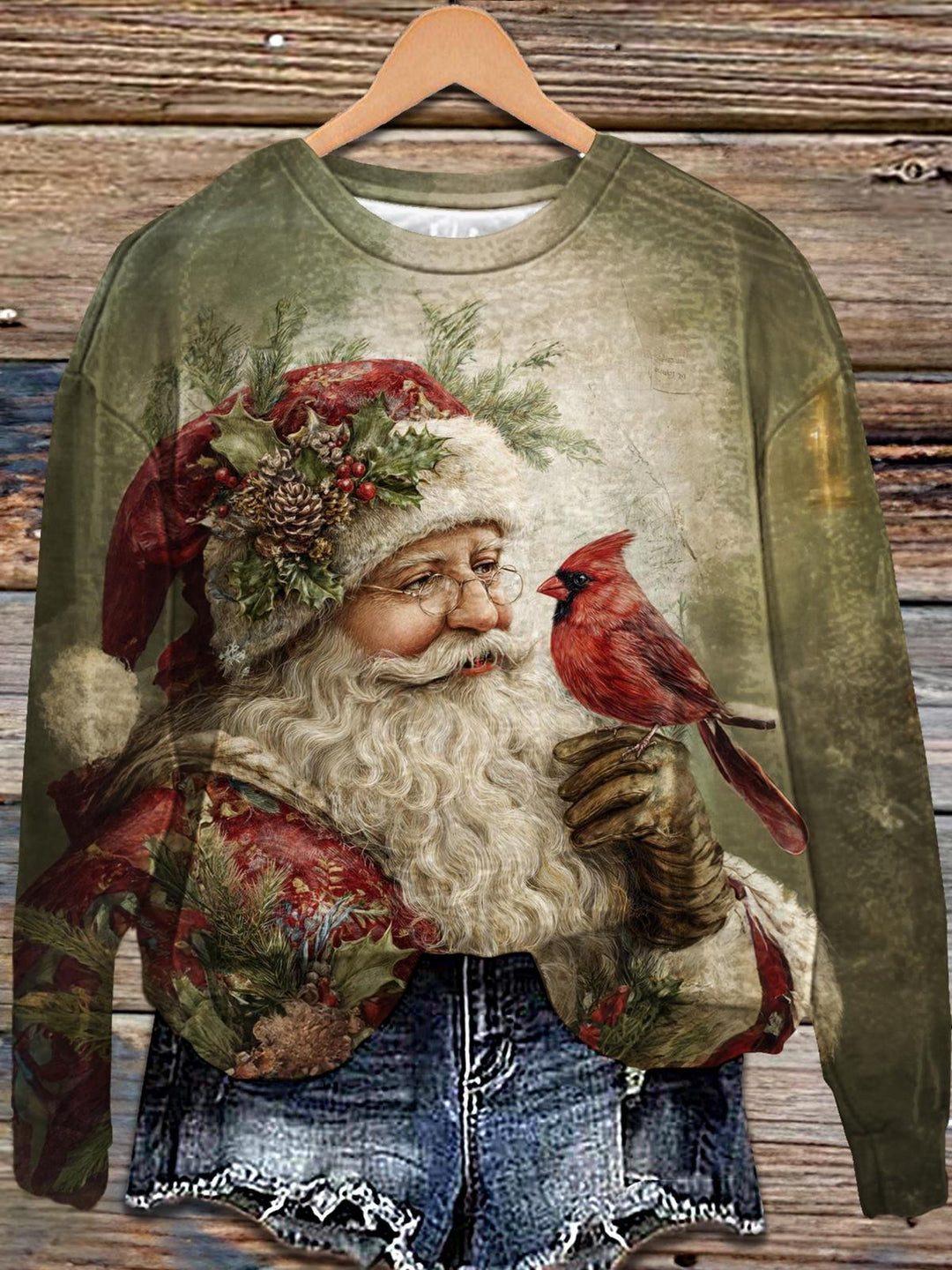 Retro Santa Claus and Bird Printed Long Sleeve Casual Top