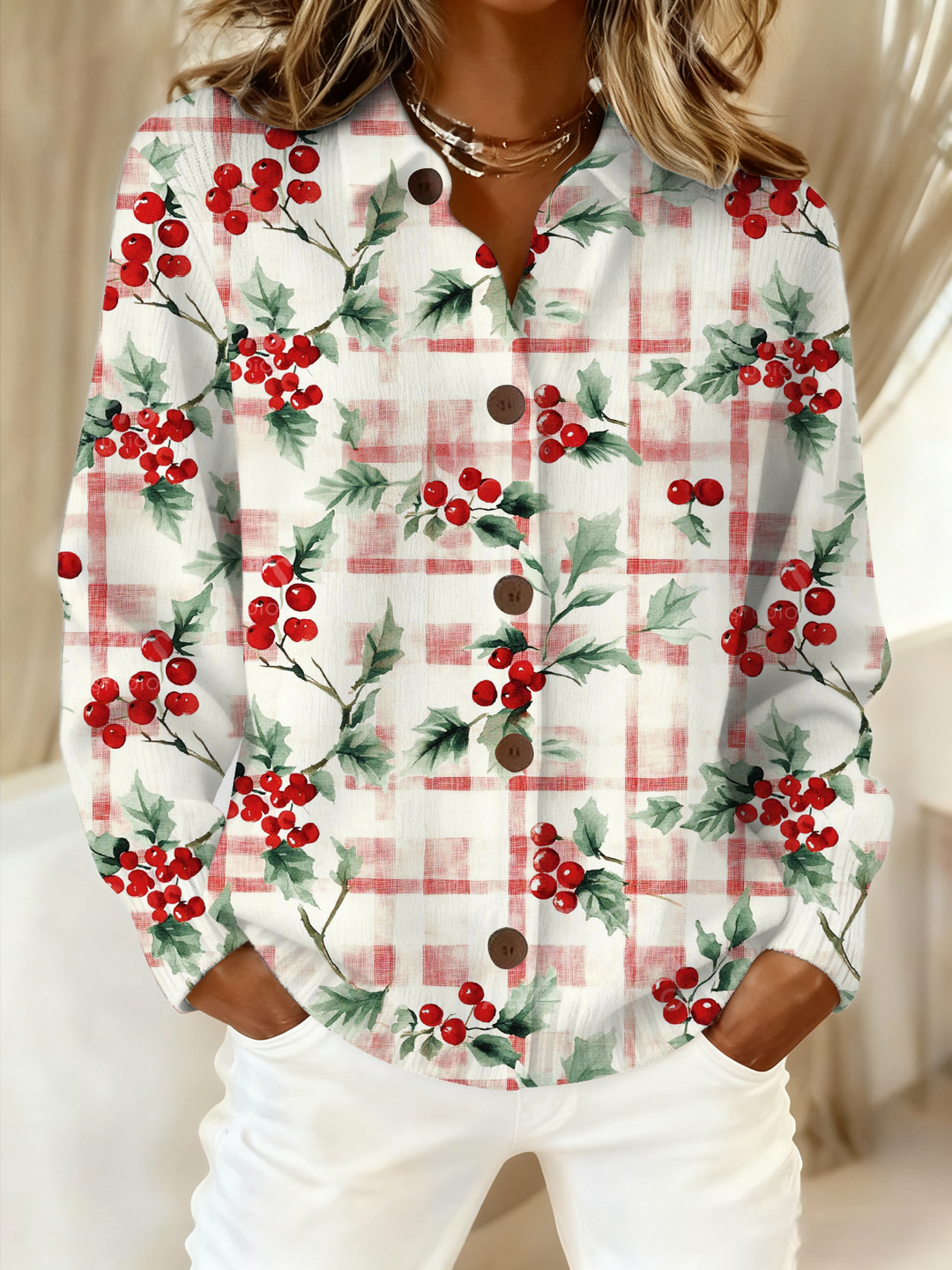 Women's Mistletoe Christmas Red Plaid Cardigan