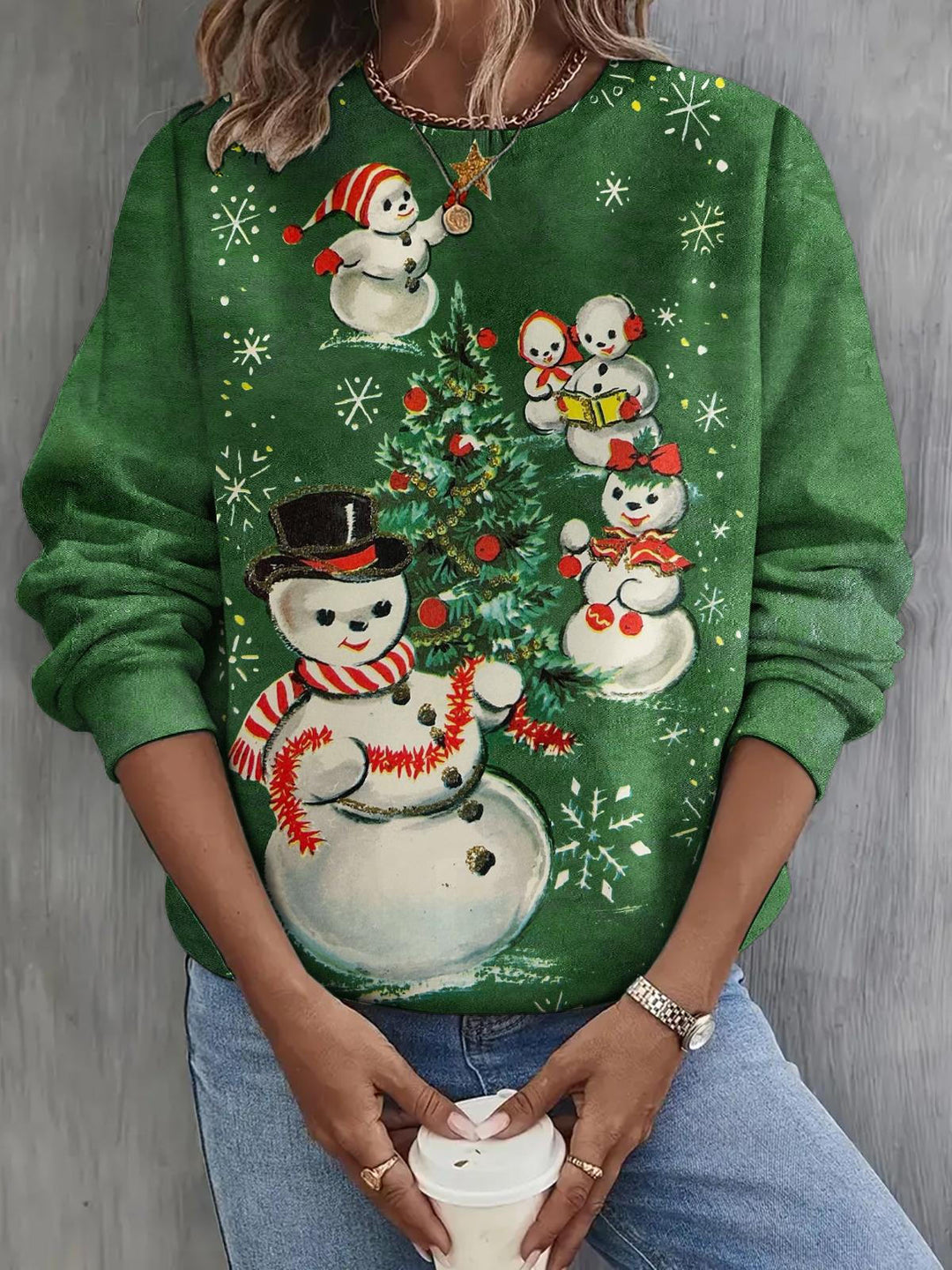 Retro Cartoon Snowman Printed Long Sleeve Casual Top