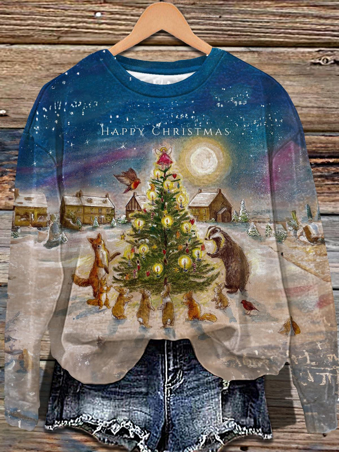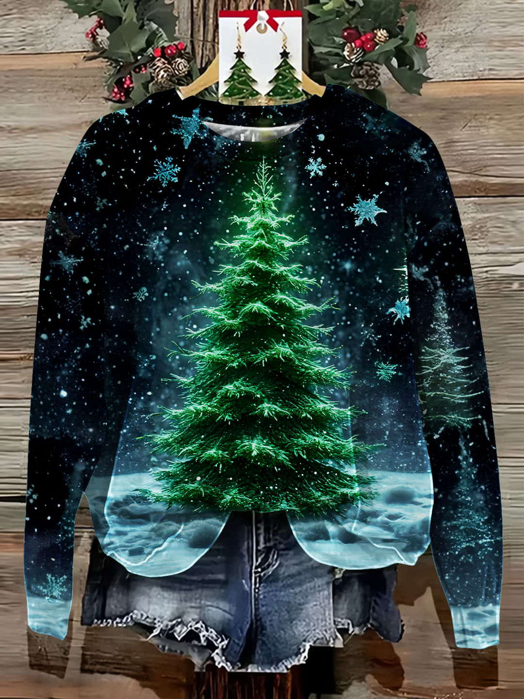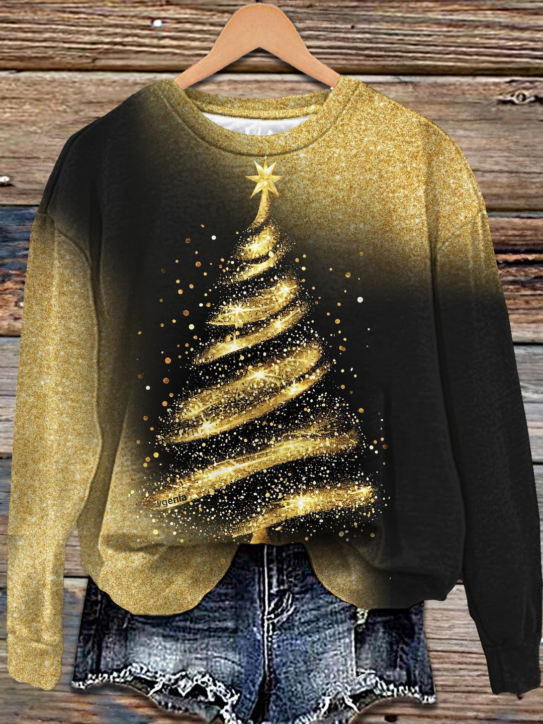 Golden Christmas Tree Printed Long Sleeve Casual Top
