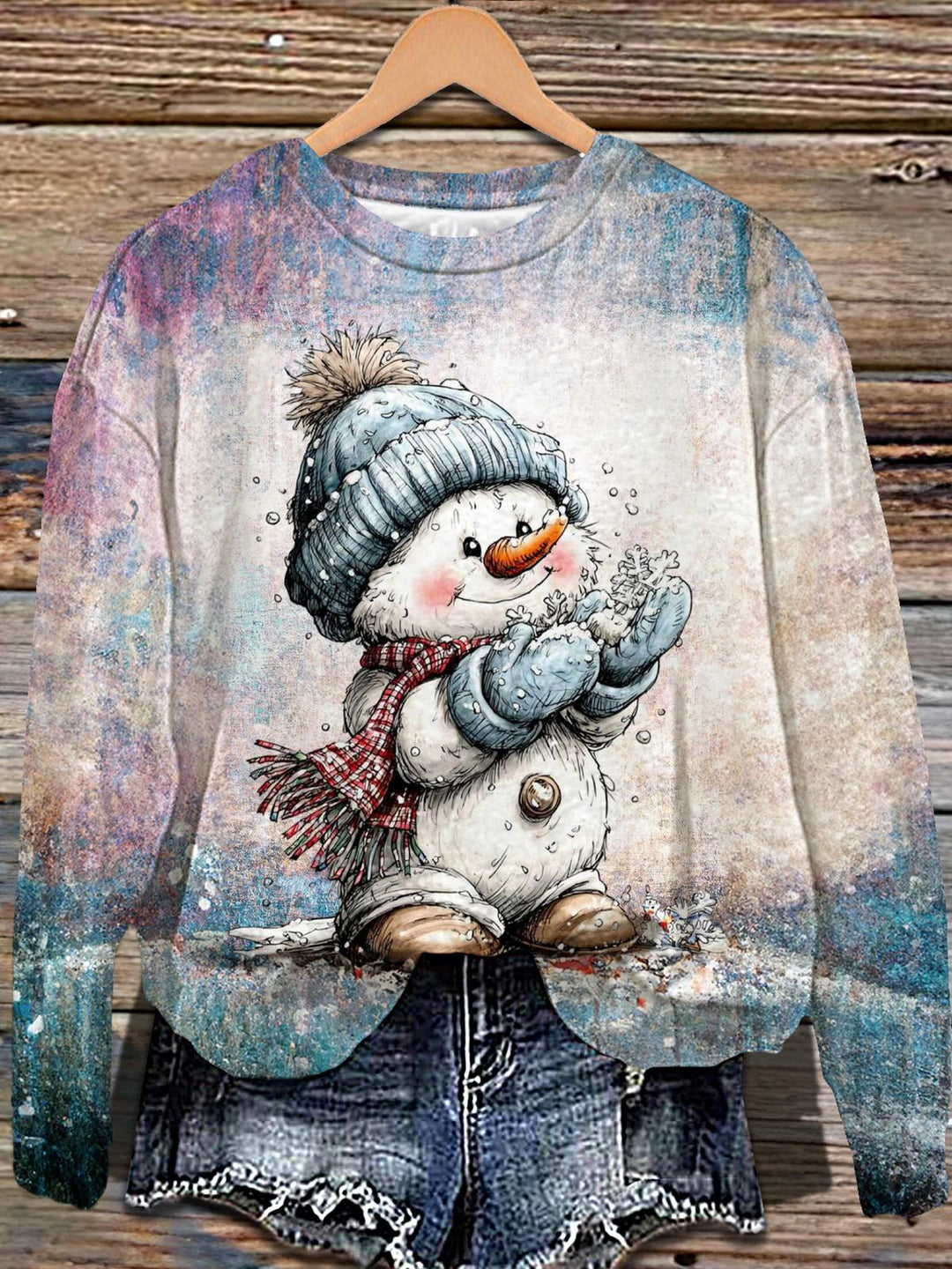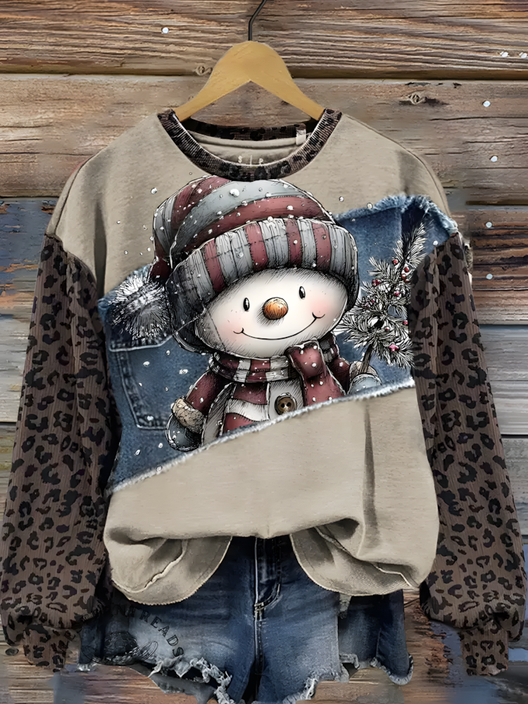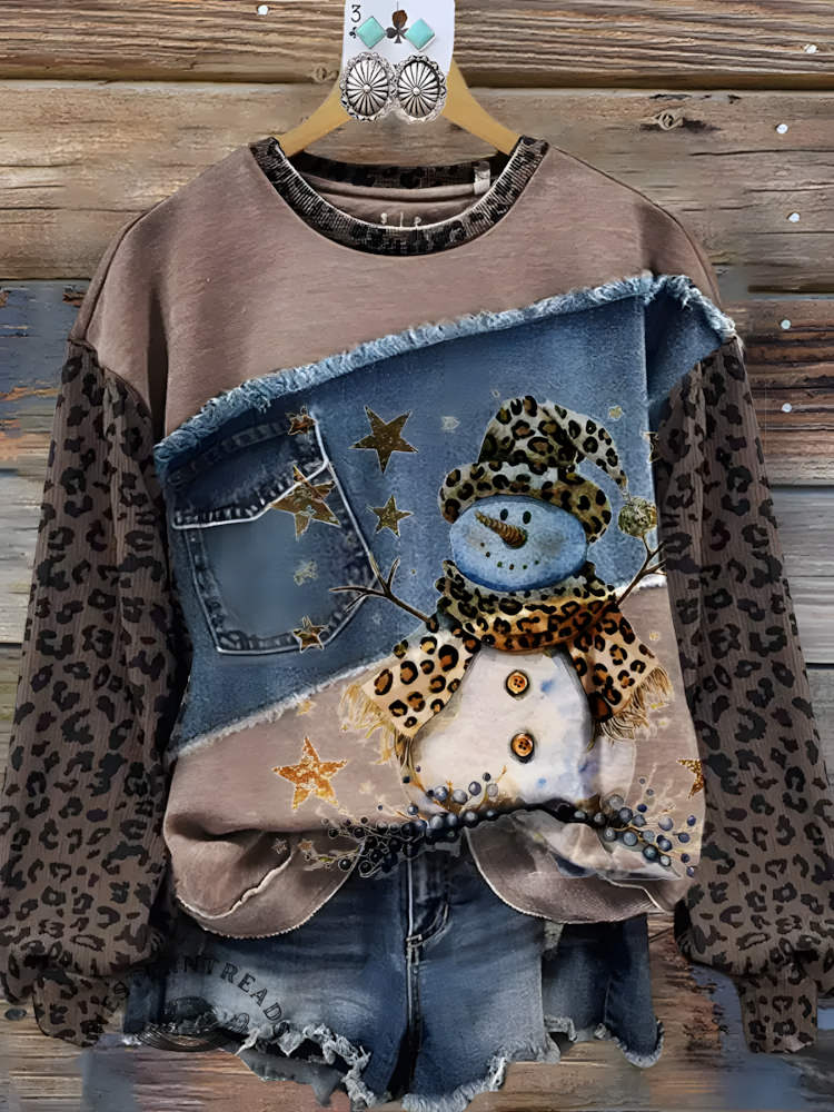 Vintage Snowman Print Patchwork Denim Leopard Printed Long Sleeve Casual Top