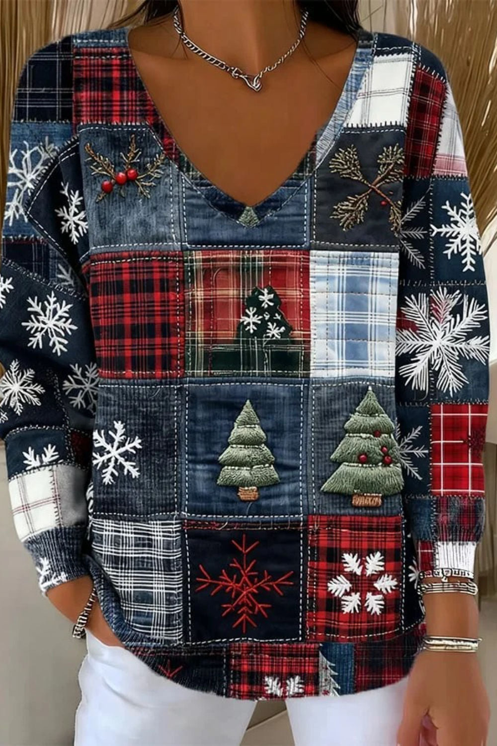 Christmas Reindeer Plaid Collage Printed Long Sleeve Casual Top