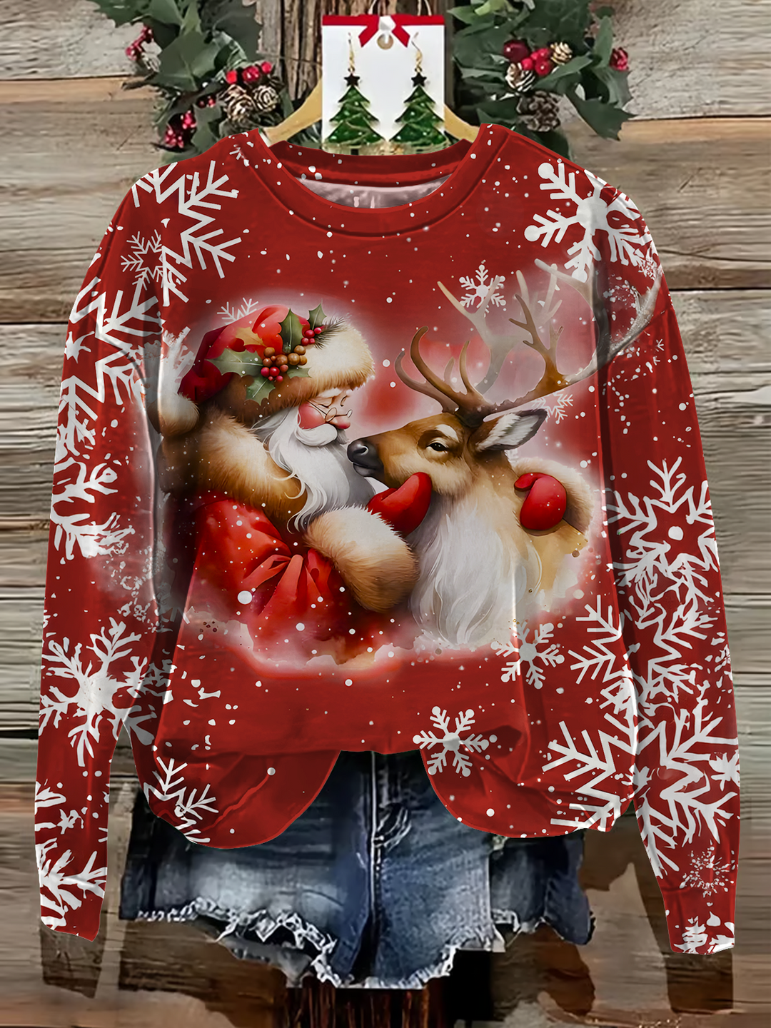 Santa With Reindeer Christmas Printed Long Sleeve Casual Top