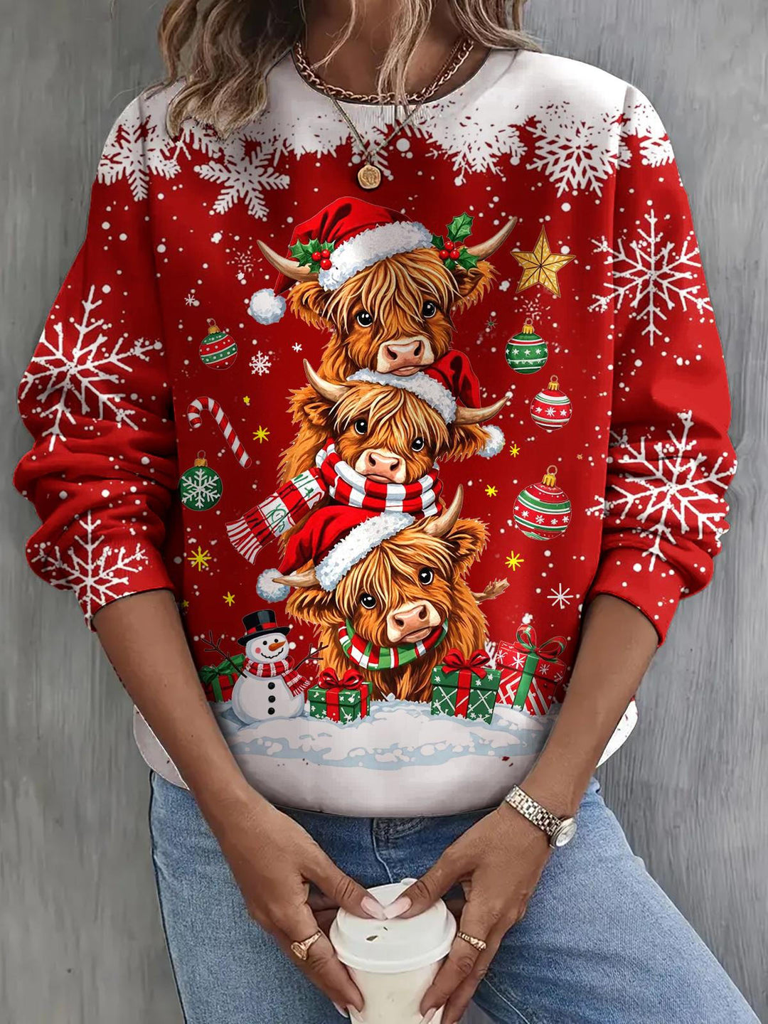 Christmas Highland Cow Print Long Sleeve Casual Top