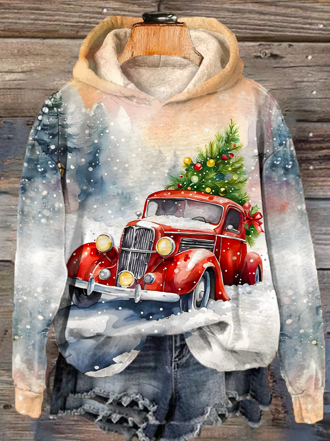 Christmas Red Truck Long Sleeve Printed Hoodie