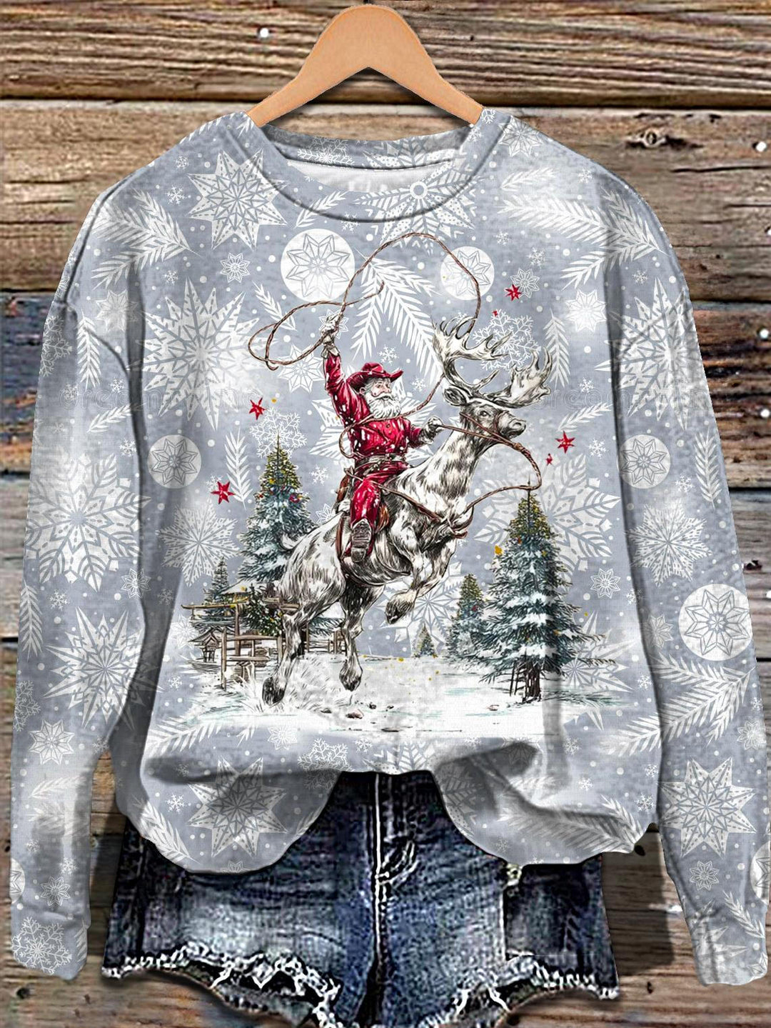Retro Cowboy Santa Claus Printed Long Sleeve Casual Top